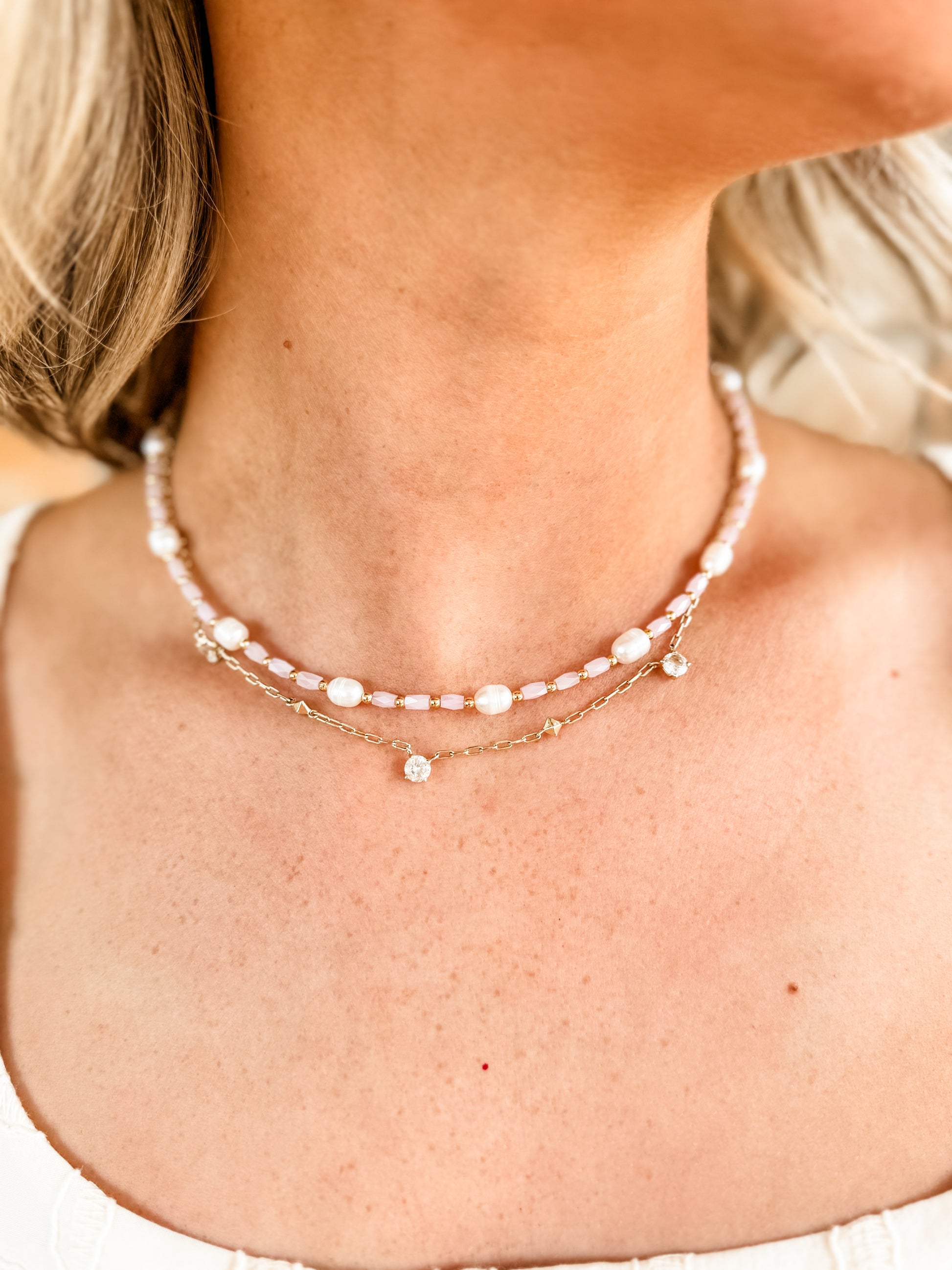 Elevate your style with the Bead Chic Necklace, featuring delicate light pink beads paired with lustrous pearls. This elegant combination adds a soft, feminine touch to any outfit, perfect for both everyday wear and special occasions. Its timeless design ensures versatility, making it a must-have accessory that enhances your natural beauty effortlessly.