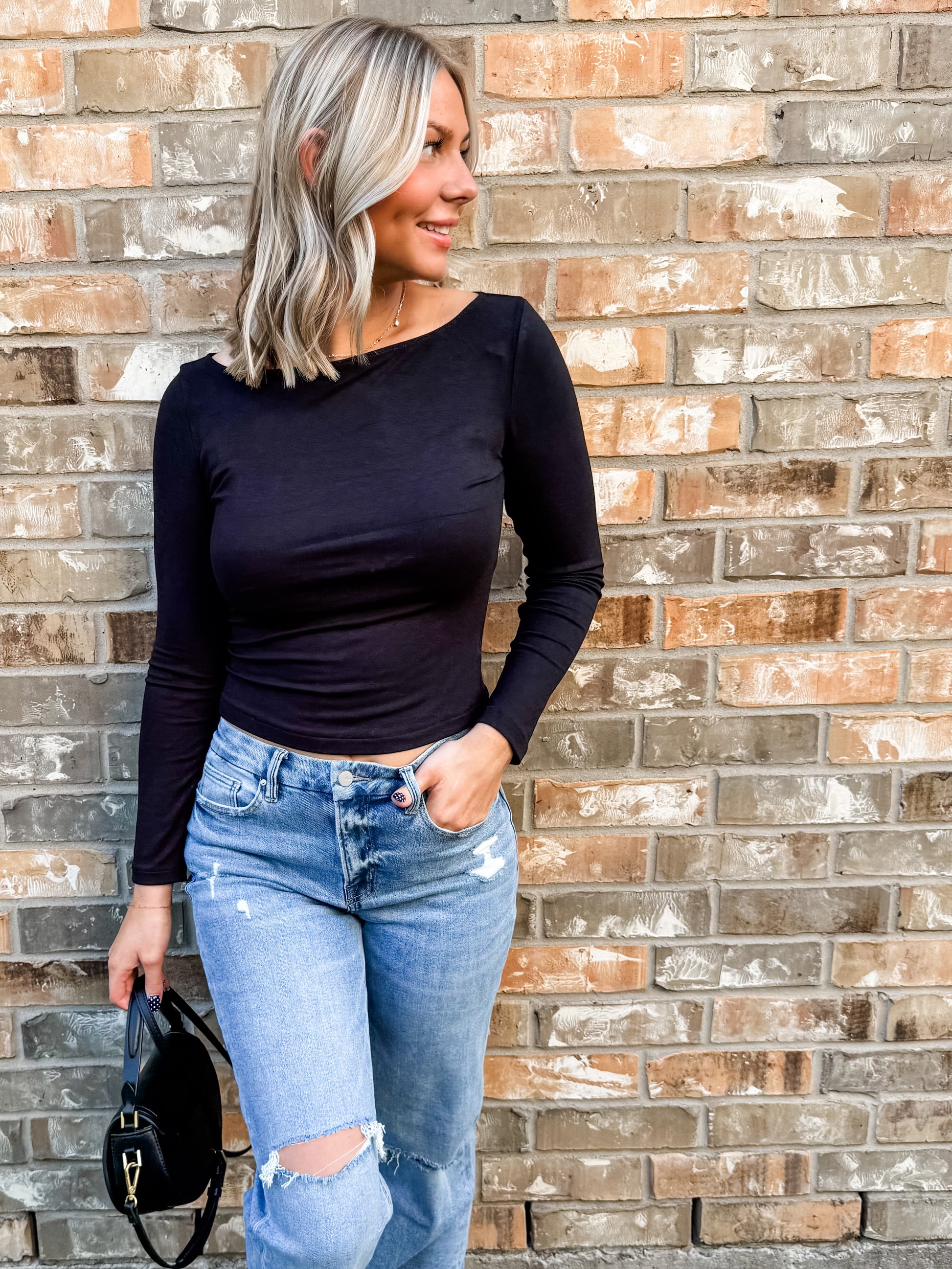 This fitted long sleeve top features a classic boat neckline, combining elegance with a streamlined silhouette. Crafted to contour comfortably, it offers a versatile layering piece suitable for both professional and casual settings. The sleek black color enhances its adaptability, making it a staple addition to any wardrobe.