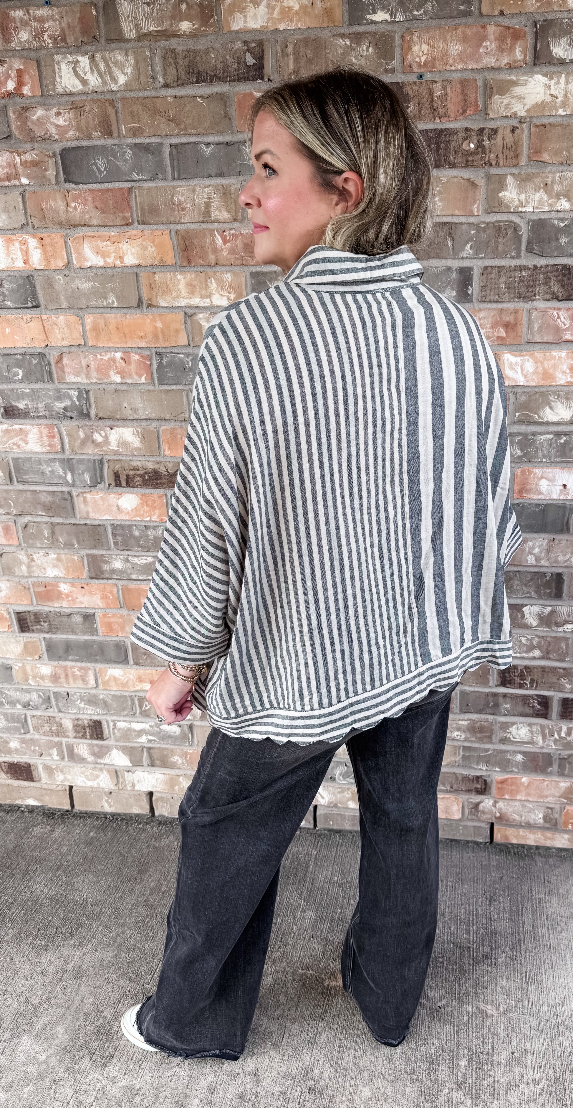 Add a splash of fun to your wardrobe with this tan and black striped shirt. Featuring buttons down the front and a crisp collar, it strikes the perfect balance between casual and chic. The flowy fabric and scalloped bottom hem give it a playful, breezy vibe—ideal for those who love a little flair in their everyday style.