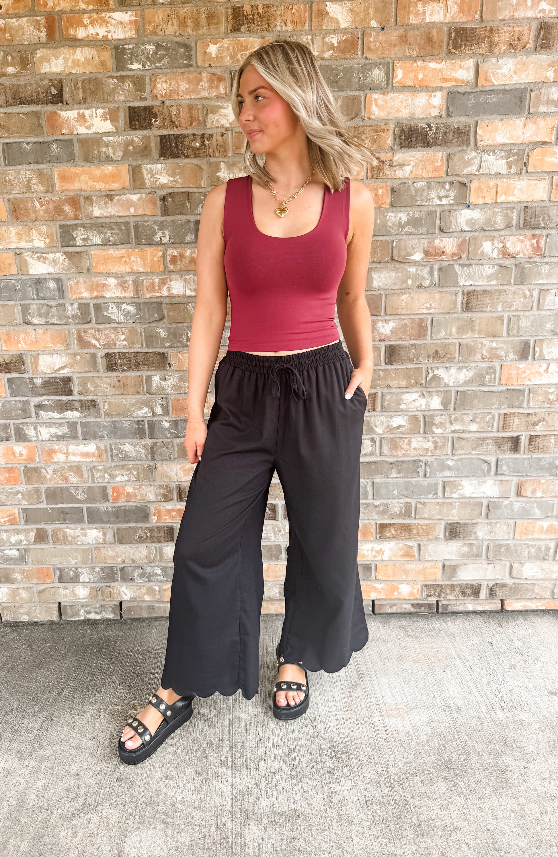 Step into comfort and style with the Bonnie Scalloped Pants. These black flowy pants feature a charming scalloped hem that adds a playful touch to your outfit. The stretchy waistband ensures a perfect fit, making them ideal for all-day wear. Effortlessly chic and fun, they’re your go-to for relaxed days or dressed-up evenings.