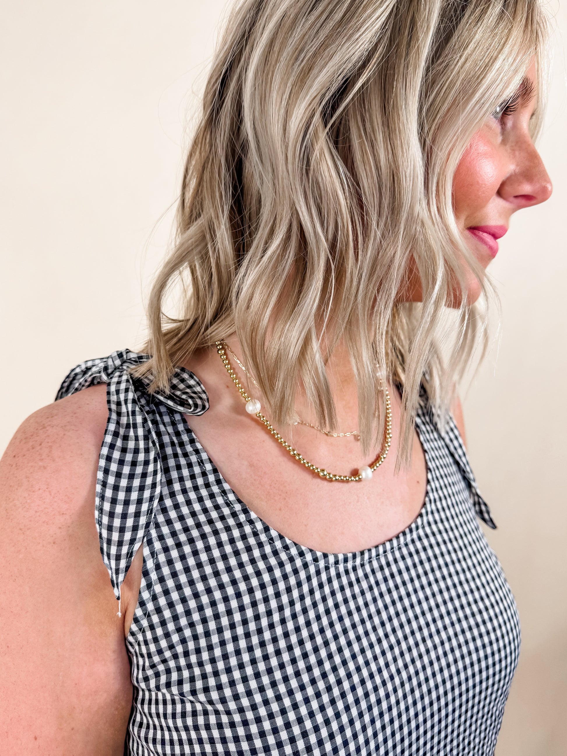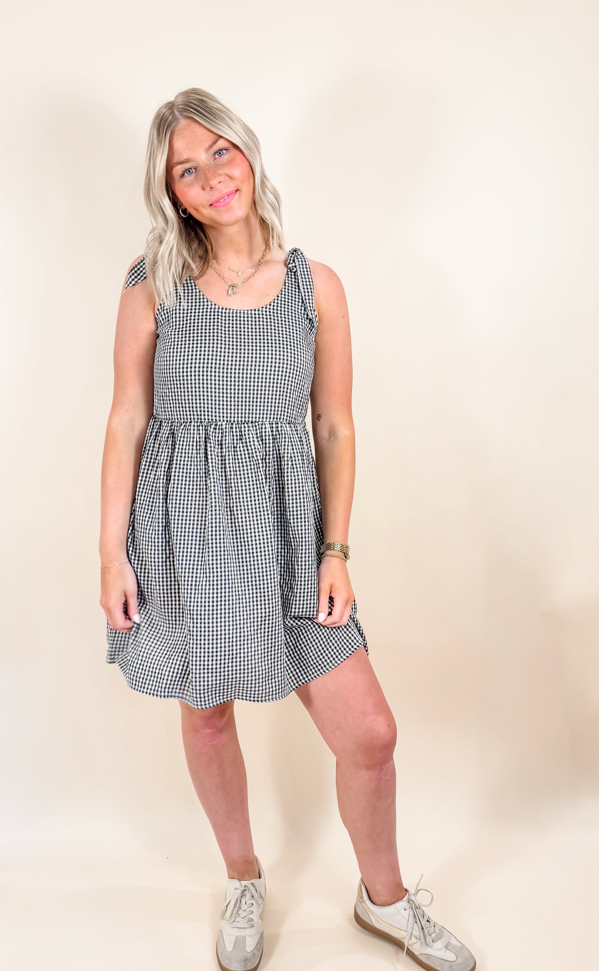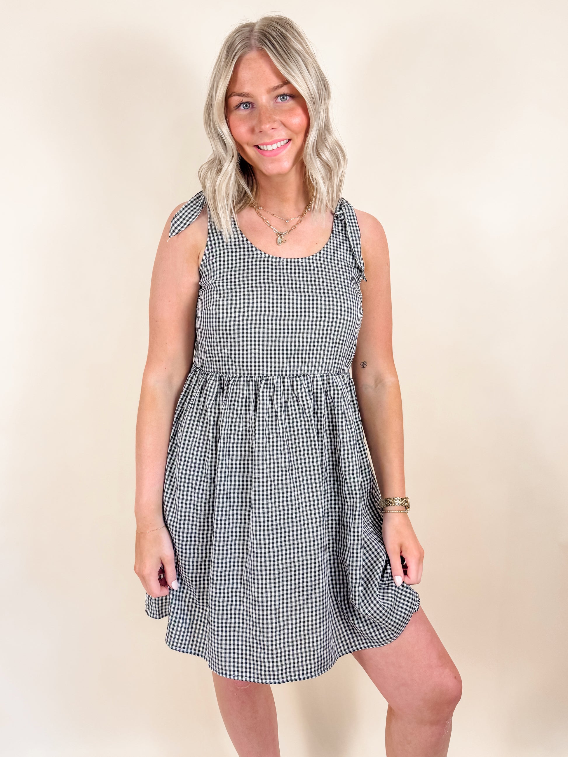 This playful black and white gingham dress features charming ribbon tie sleeves and a short, breezy silhouette perfect for sunny days. Its light, airy design keeps you comfortable while adding a flirty, fun touch to your wardrobe. Ideal for casual outings or weekend adventures, this dress brings effortless style with a cheerful vibe.
