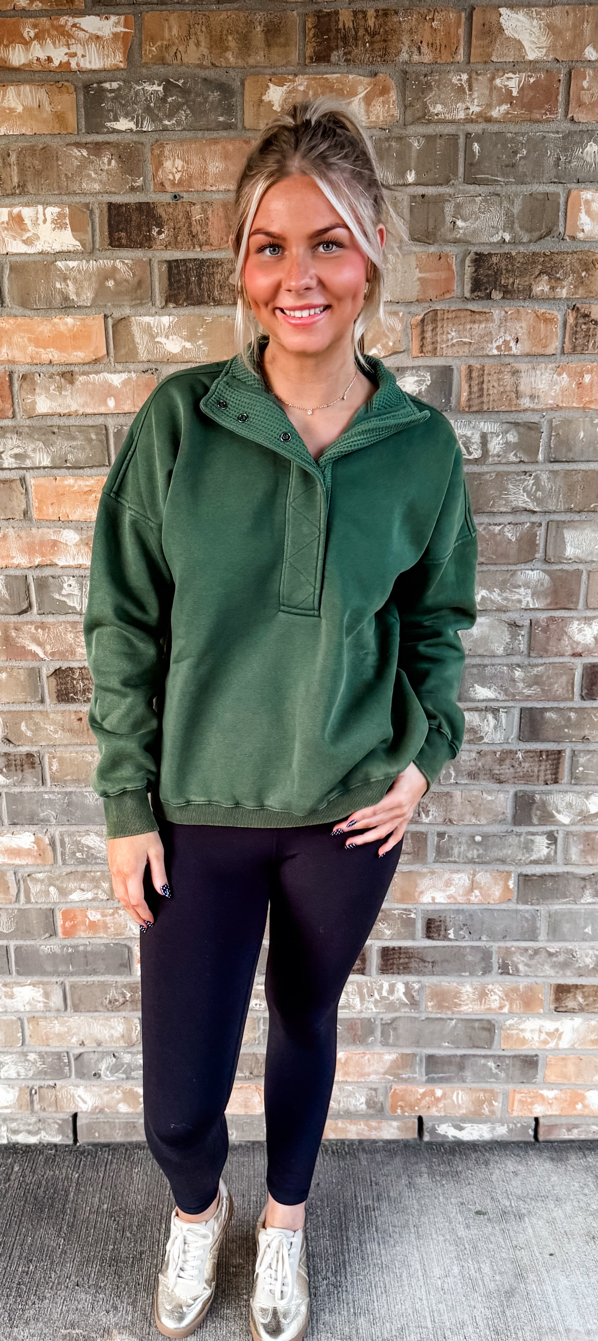 Stay effortlessly cool in this army green quarter-button pullover sweatshirt. With its long sleeves and easy button-up front, it’s perfect for layering during chilly days or cozy nights. The relaxed fit and rich green shade add a playful touch to your casual look. Whether you're out for an adventure or just lounging, this sweatshirt is your go-to for comfort with a hint of style.