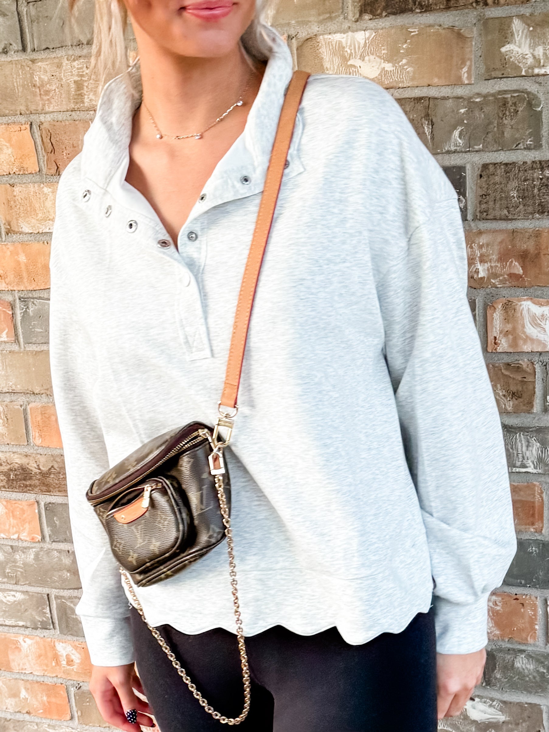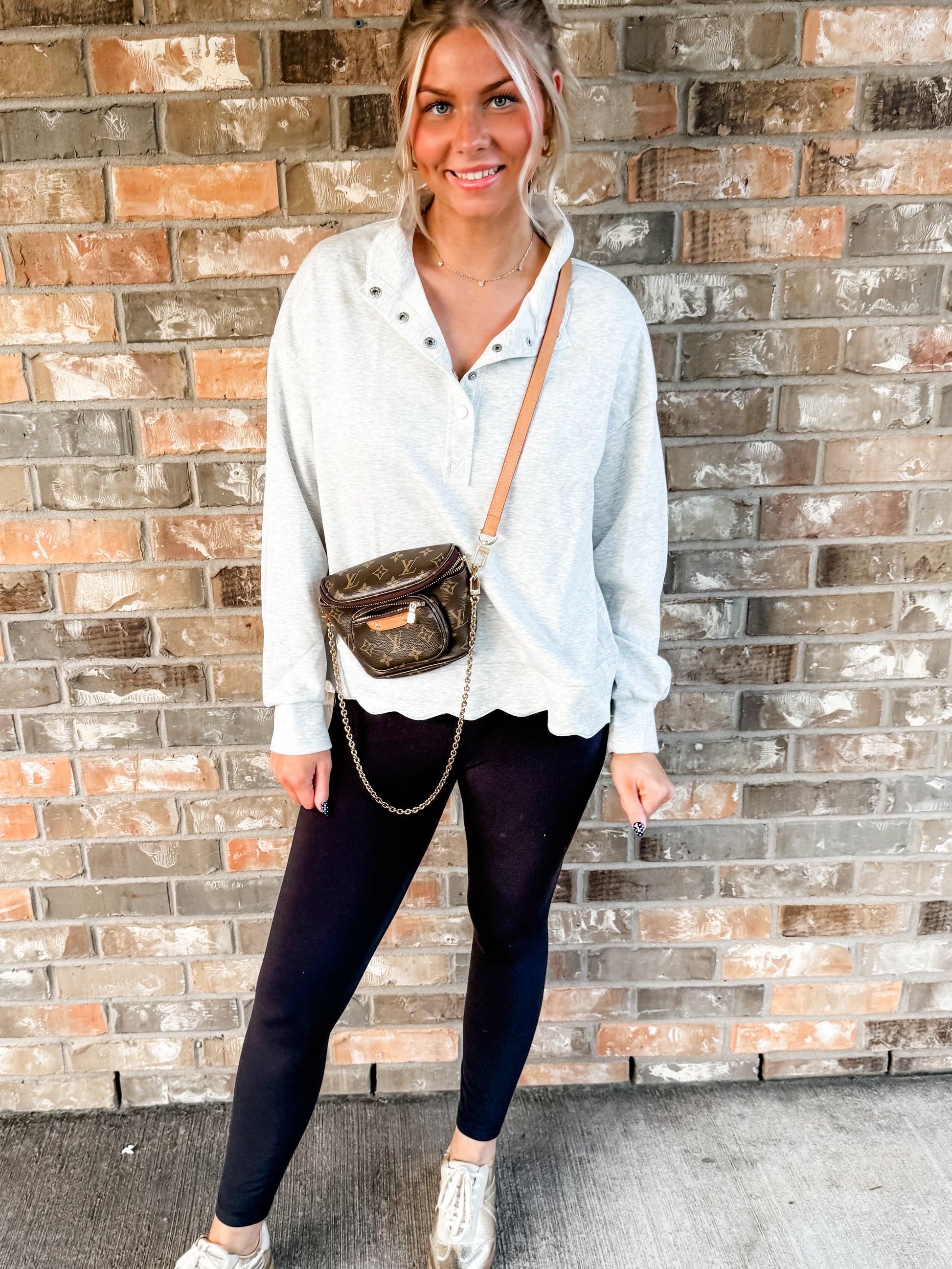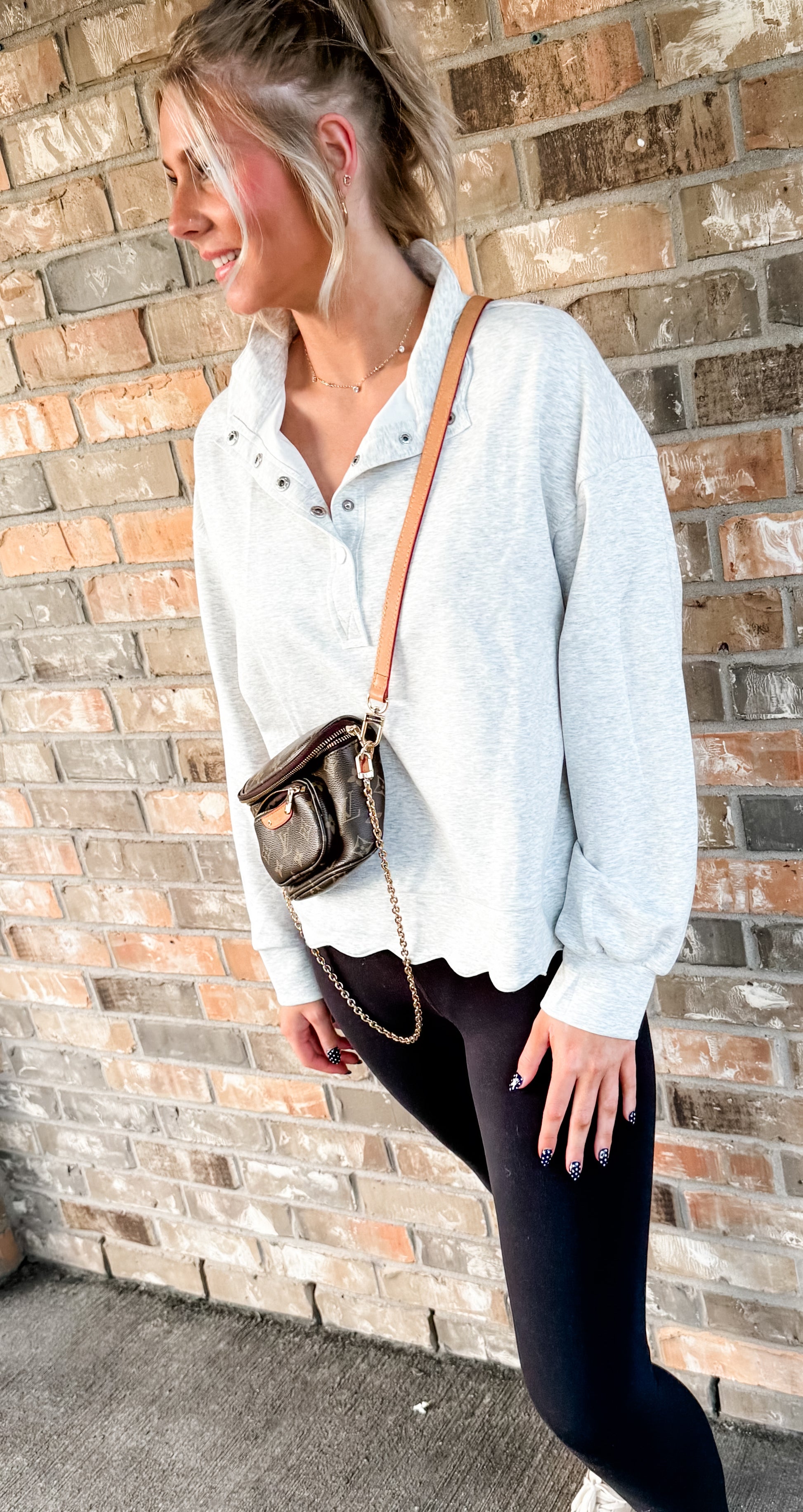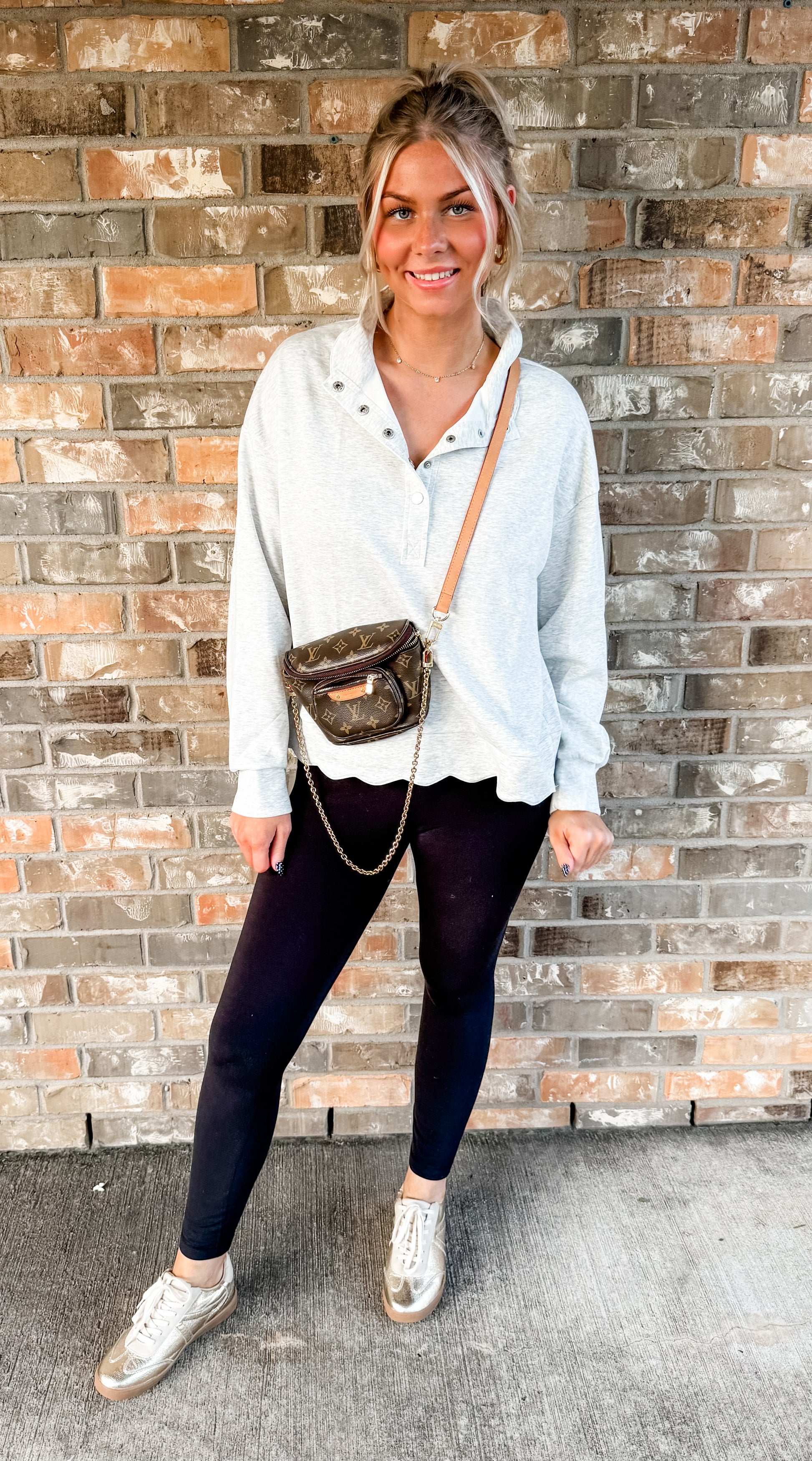 Stay cozy and charming in this grey scalloped quarter-button sweatshirt. Its playful scalloped edges add a unique twist to a classic silhouette, while the quarter-button design lets you adjust your look and comfort with ease. Perfect for layering or lounging, this sweatshirt brings a fun, fresh vibe to your casual wardrobe.
