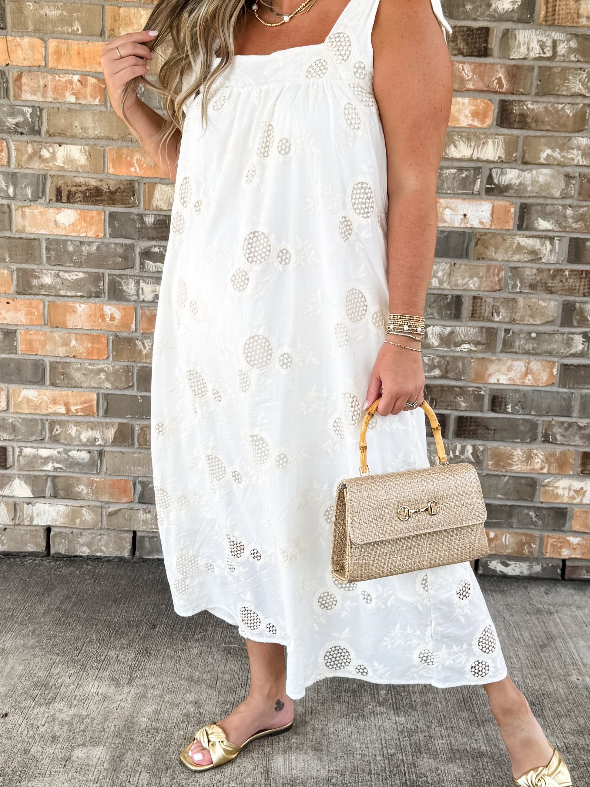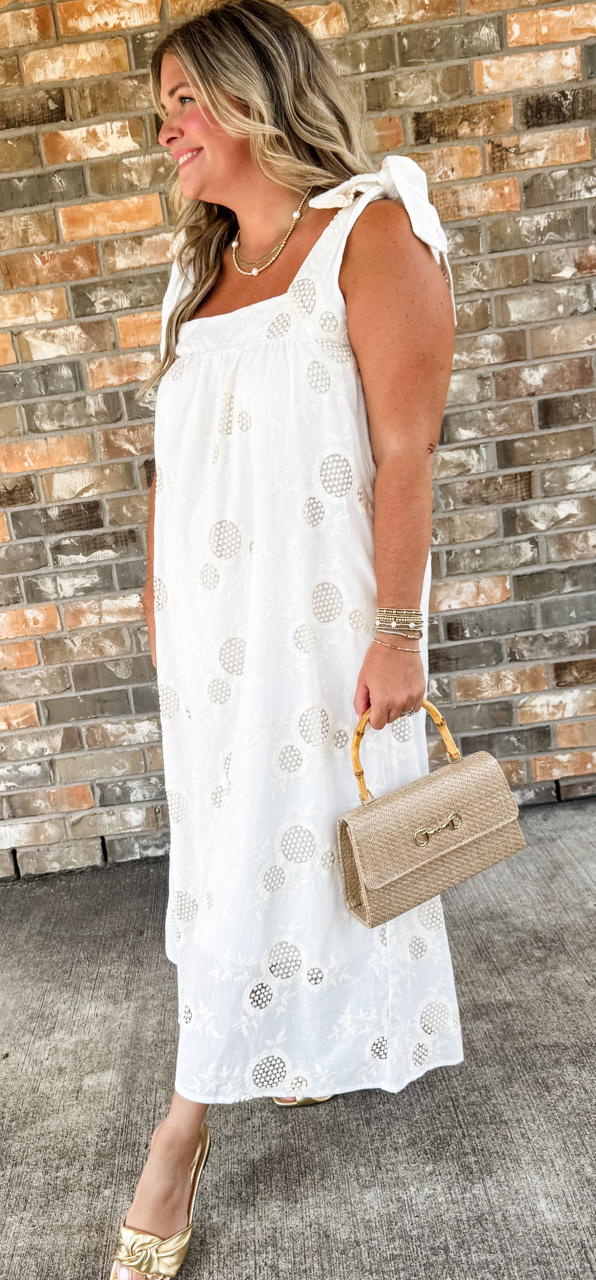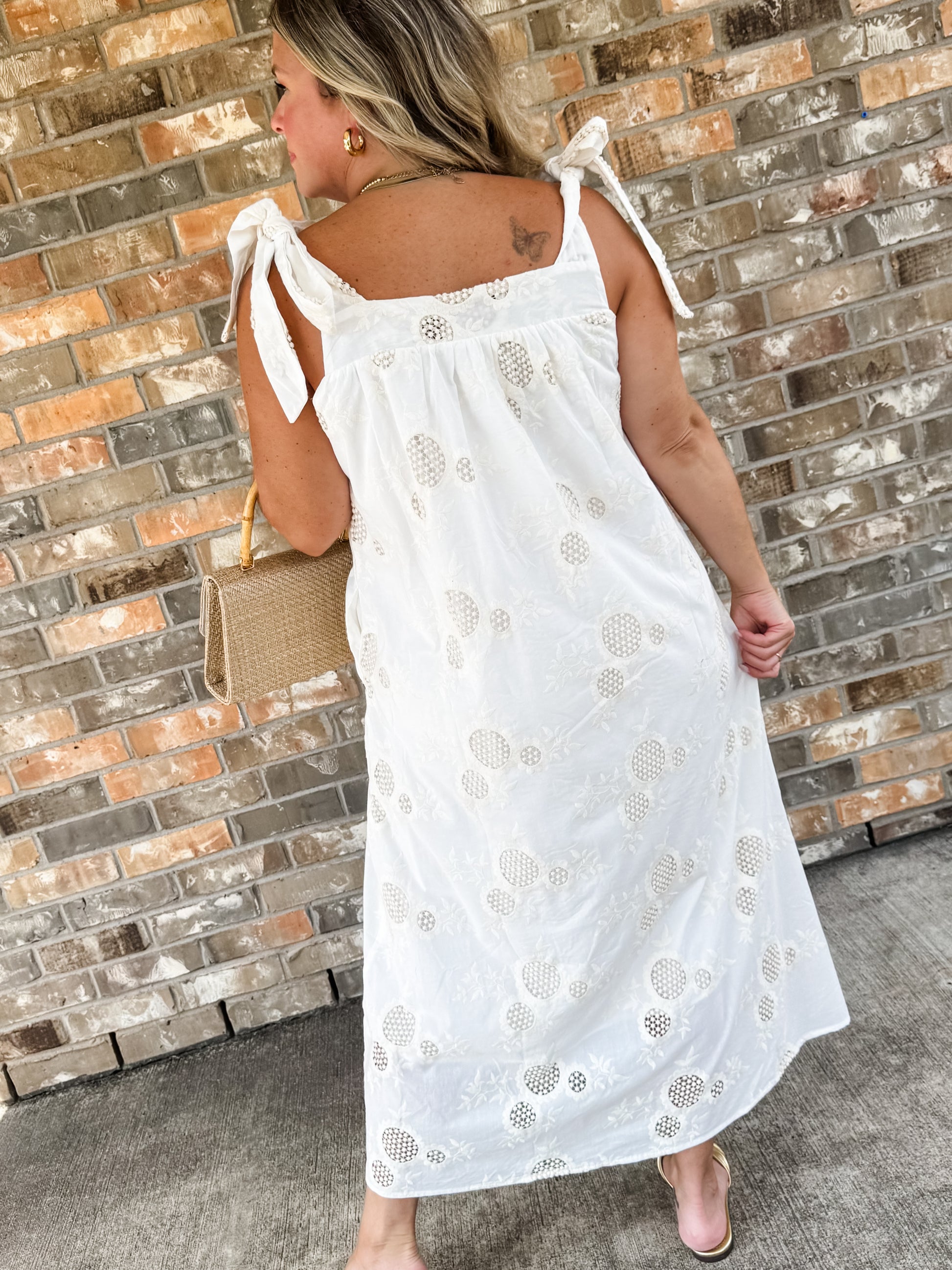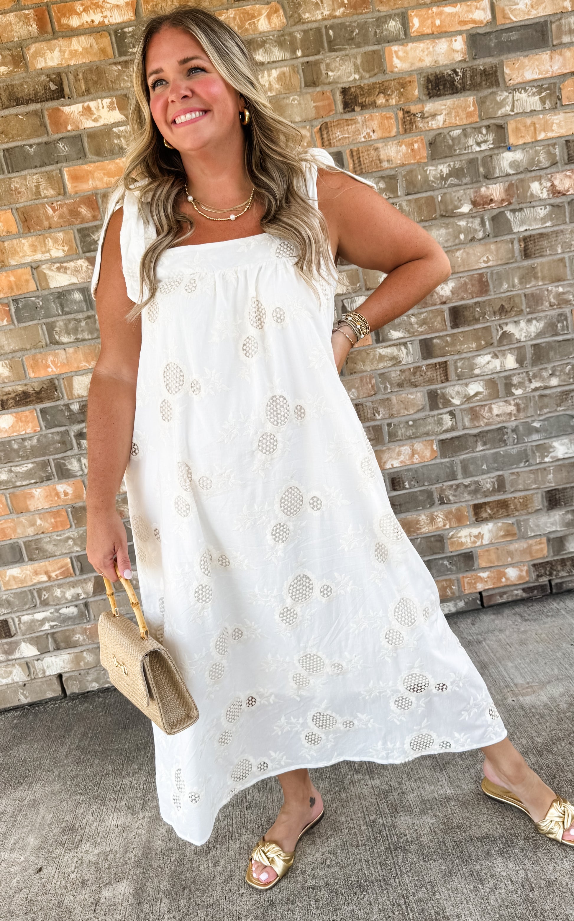 The Ivory Lace Maxi is a playful white maxi dress that features delicate lace details and charming tie bow sleeves. Its square neckline adds a fresh, flattering touch, highlighting your shoulders with a hint of elegance. The flowing design ensures comfort and grace, making it perfect for sunny days, garden parties, or casual outings where you want to feel effortlessly stylish and fun.