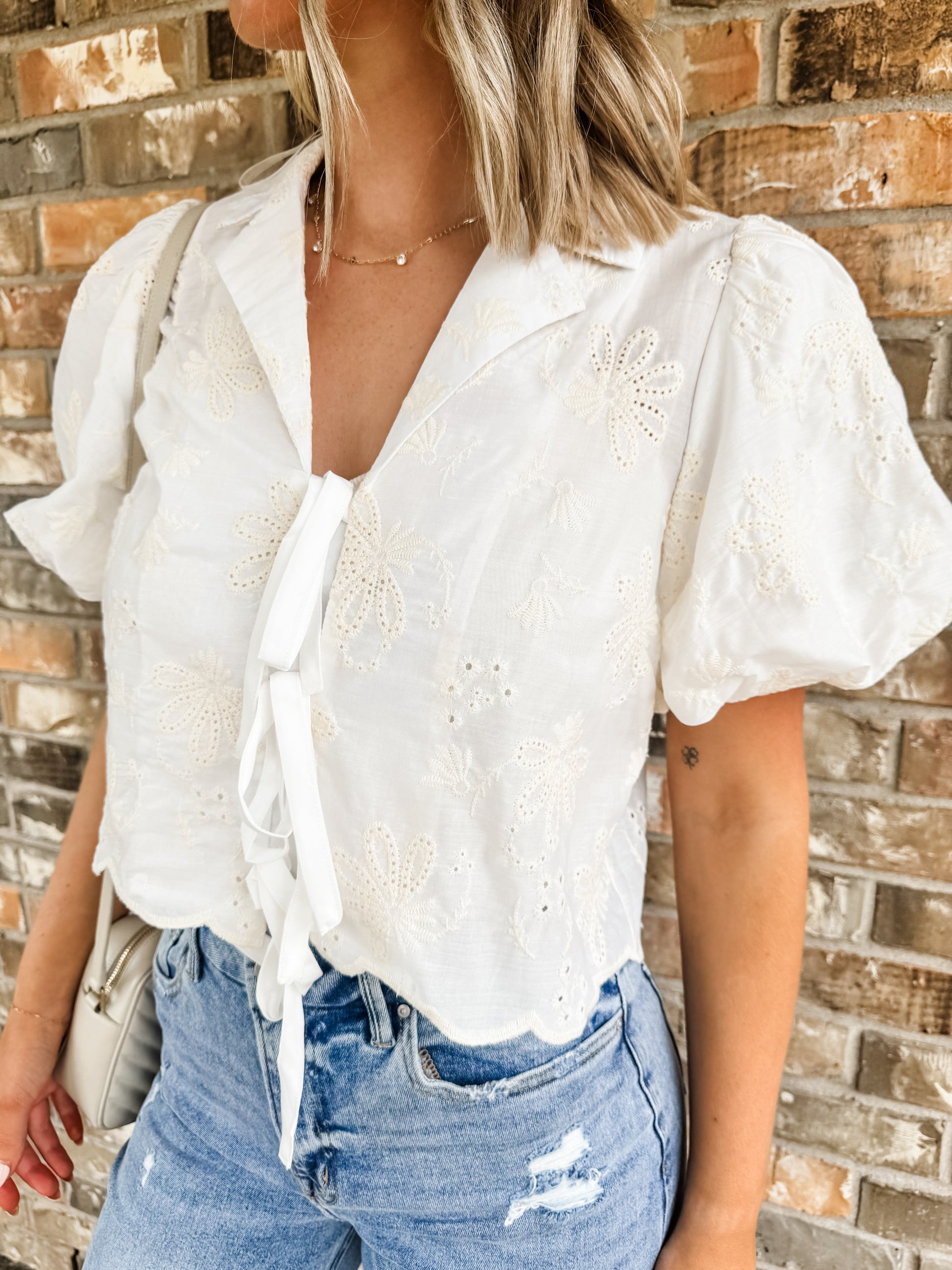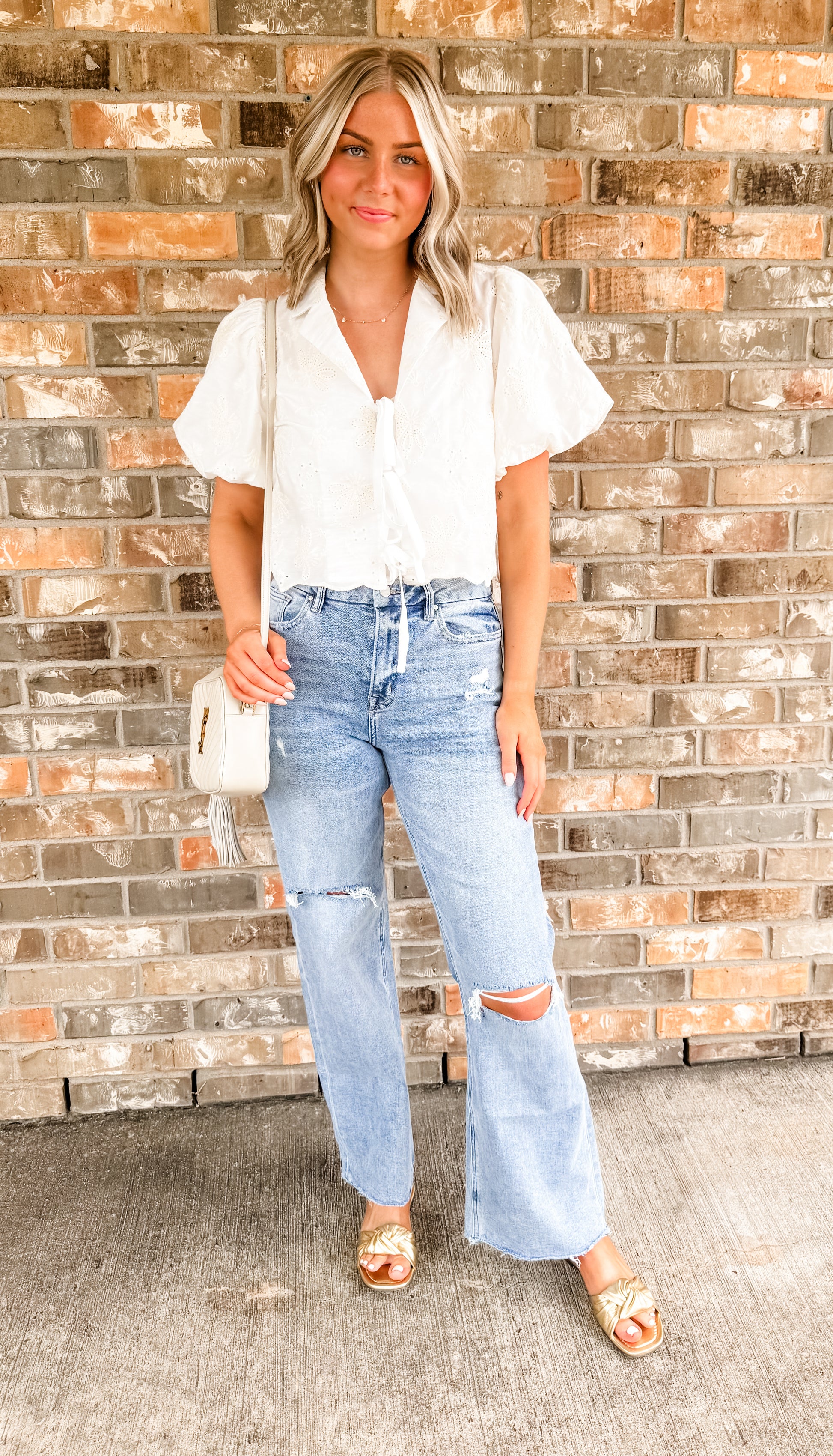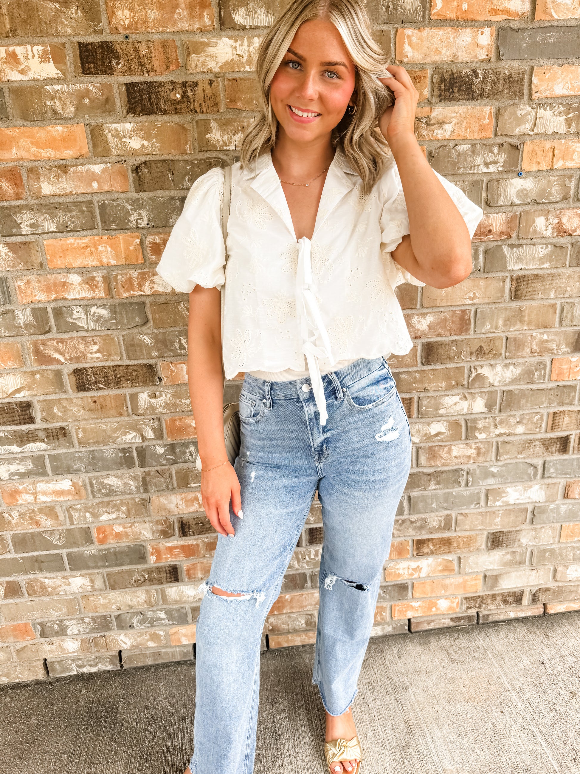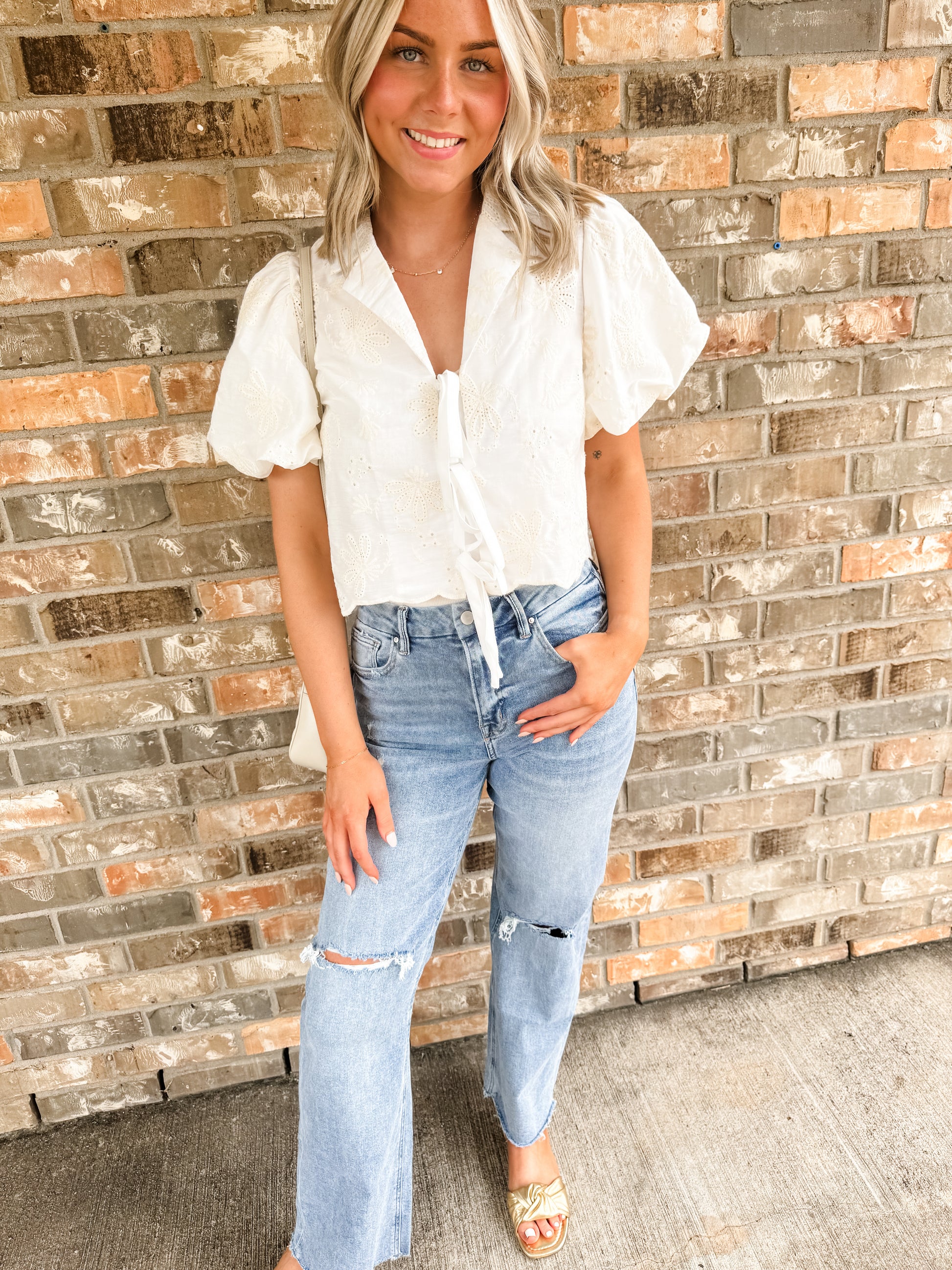 The Ivy Eyelet Top is a stylish choice featuring delicate eyelet fabric and charming puff sleeves that add volume and elegance. Its bow tie front creates a flattering silhouette, perfect for dressing up or down. This top offers a blend of comfort and sophistication, making it an essential piece for your wardrobe.