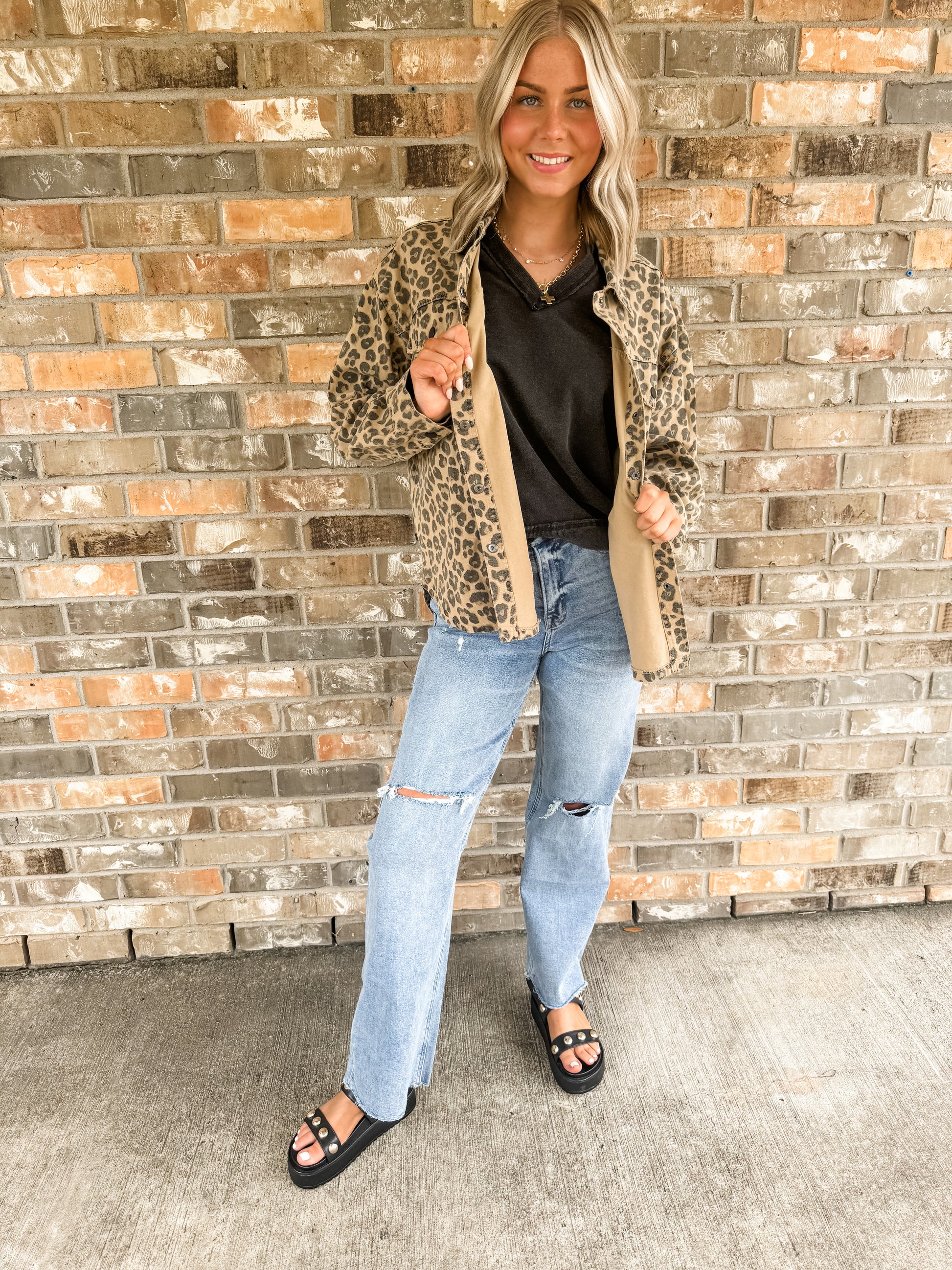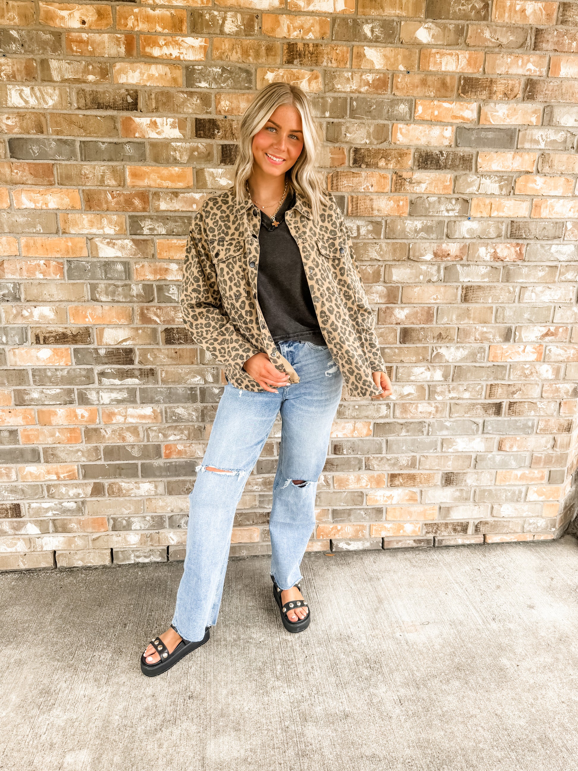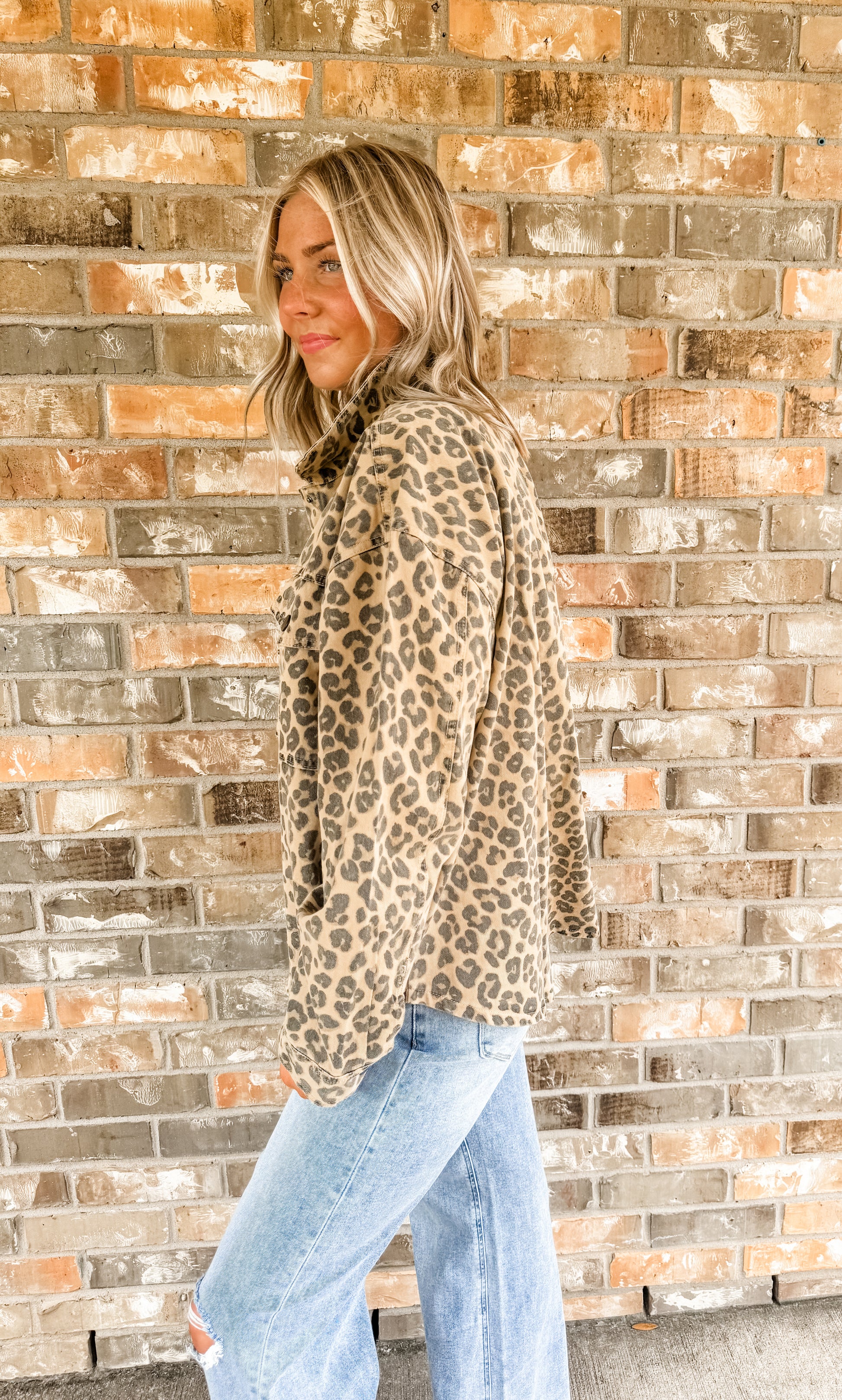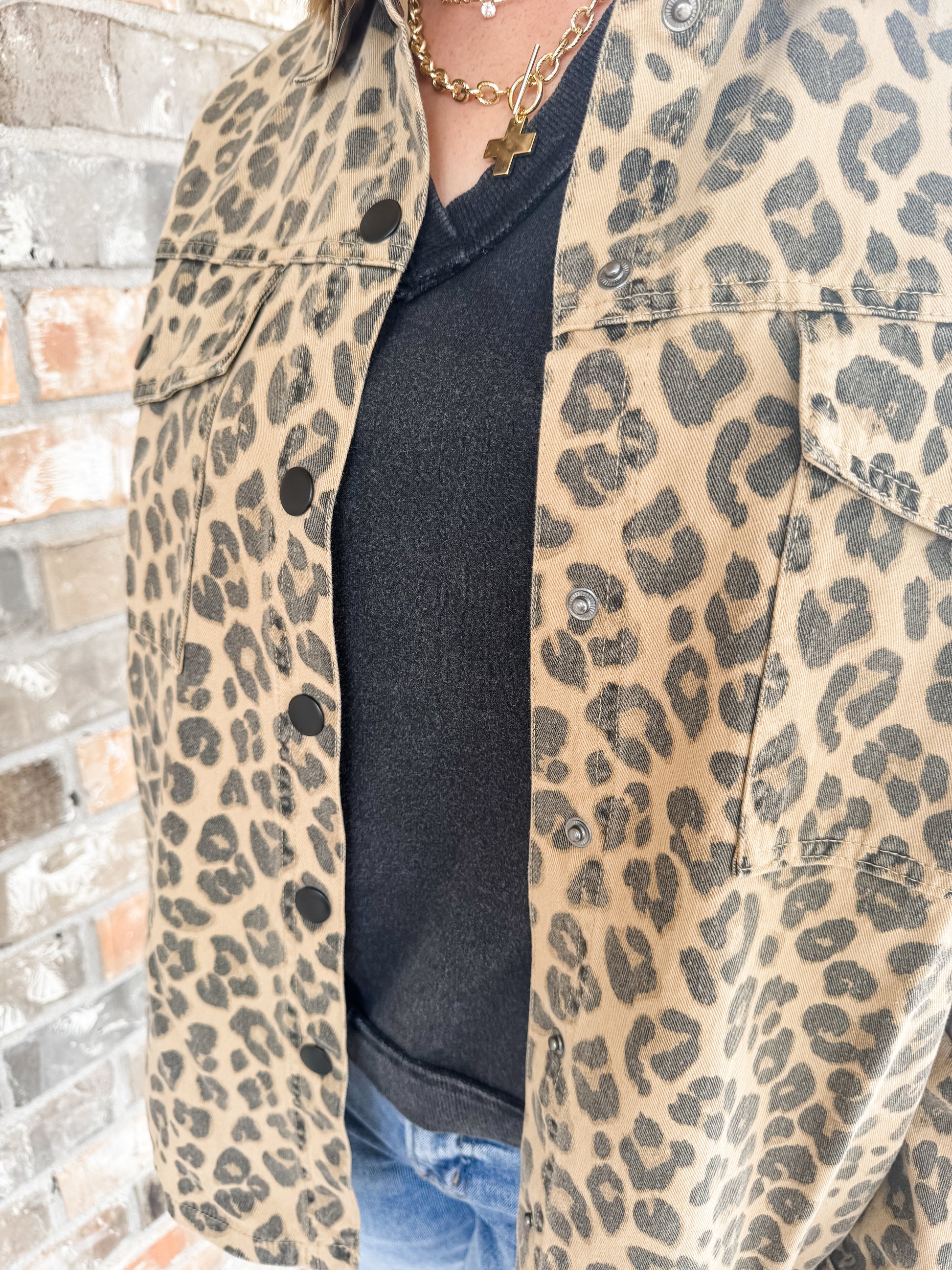 The Lucy Leopard jean jacket features a bold cheetah print design that instantly elevates any outfit. Crafted for both style and comfort, this jacket adds a fierce, trendy edge to your wardrobe. Perfect for layering, it pairs effortlessly with casual or chic ensembles, making it a must-have for fashion-forward looks. Embrace your wild side with the Lucy Leopard and stand out wherever you go.