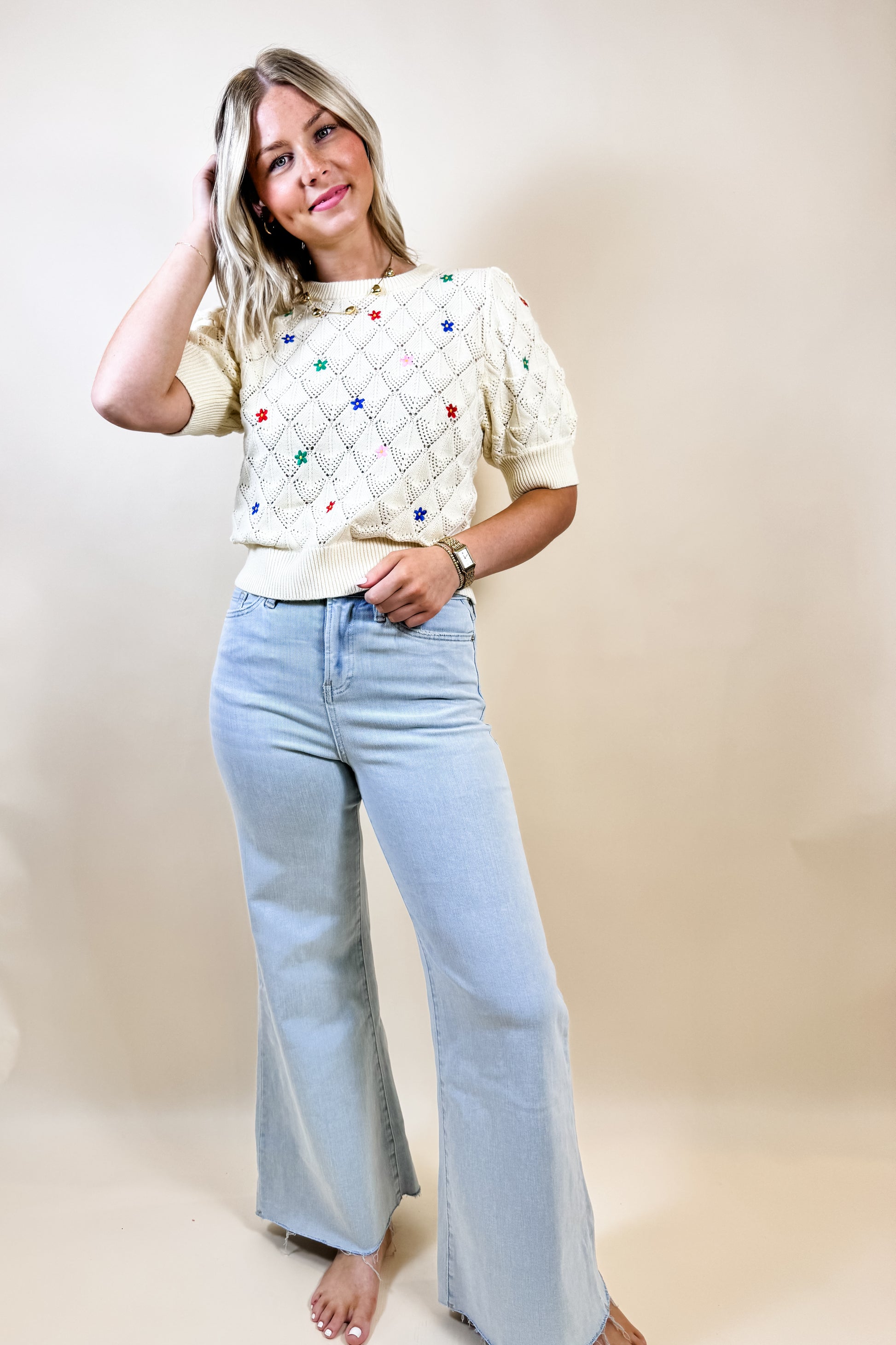 Step into comfort and style with the Mica Denim light wash wide leg stretch jeans. These jeans offer a relaxed fit with a playful wide leg silhouette, perfect for twirling through your day. The stretchy fabric moves with you, making every step feel easy and breezy. Whether you're dressing up or keeping it casual, these jeans add a fun, fresh vibe to your wardrobe.