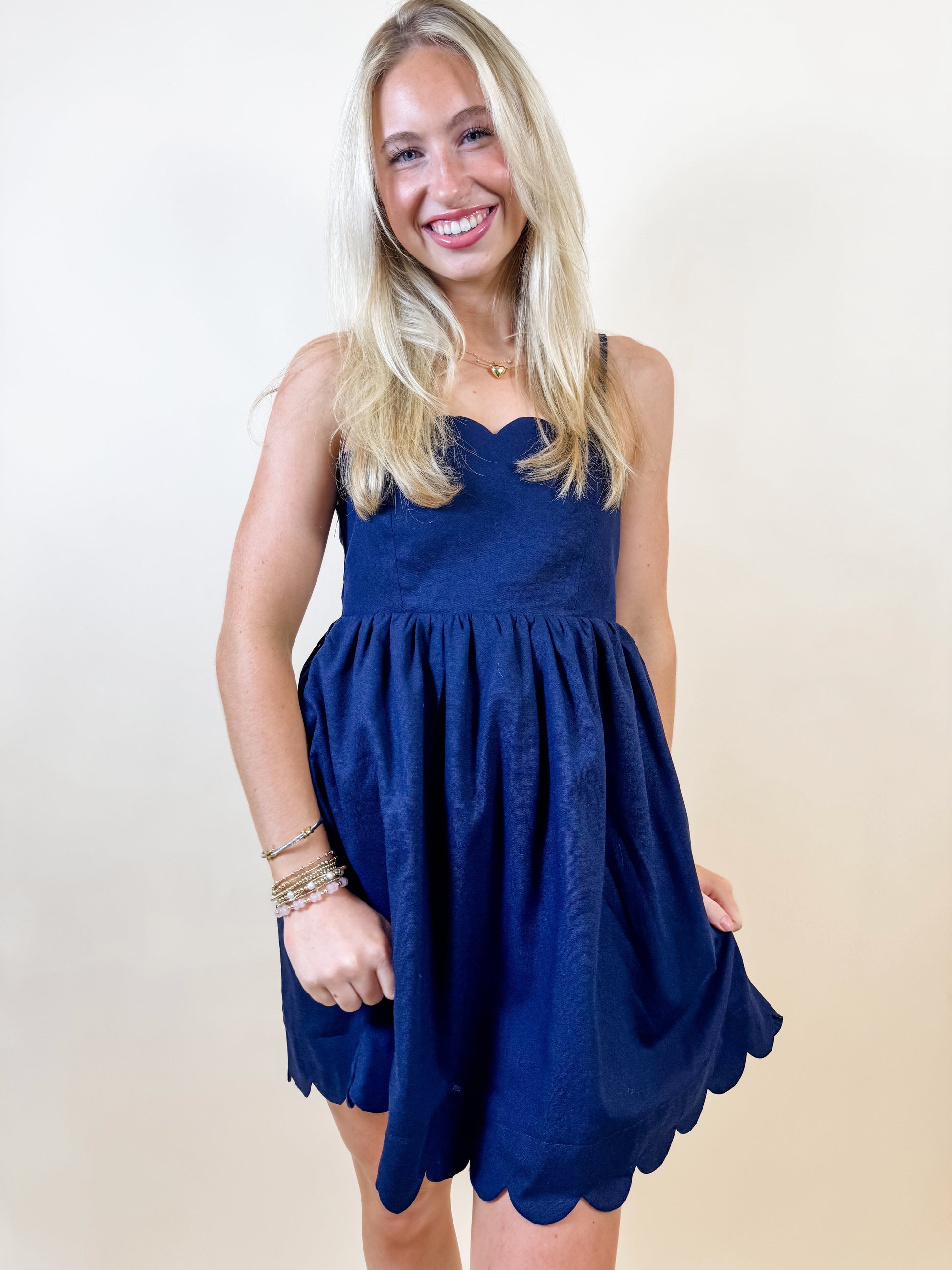 This playful navy dress showcases a short, flirty design with delicate scalloped trim along the neckline. Spaghetti straps lead to a charming bow tie at the back, adding a sweet and feminine detail. Perfect for sunny days or casual nights out, it brings a fun and fresh vibe to your wardrobe.