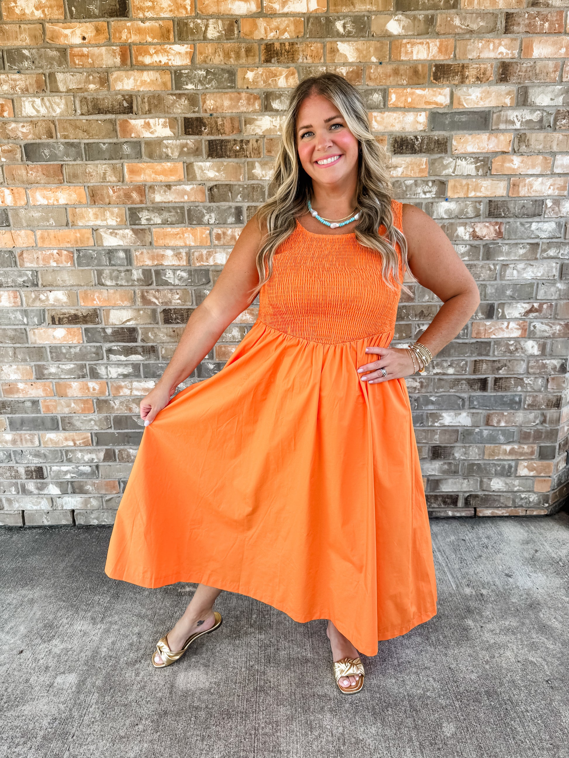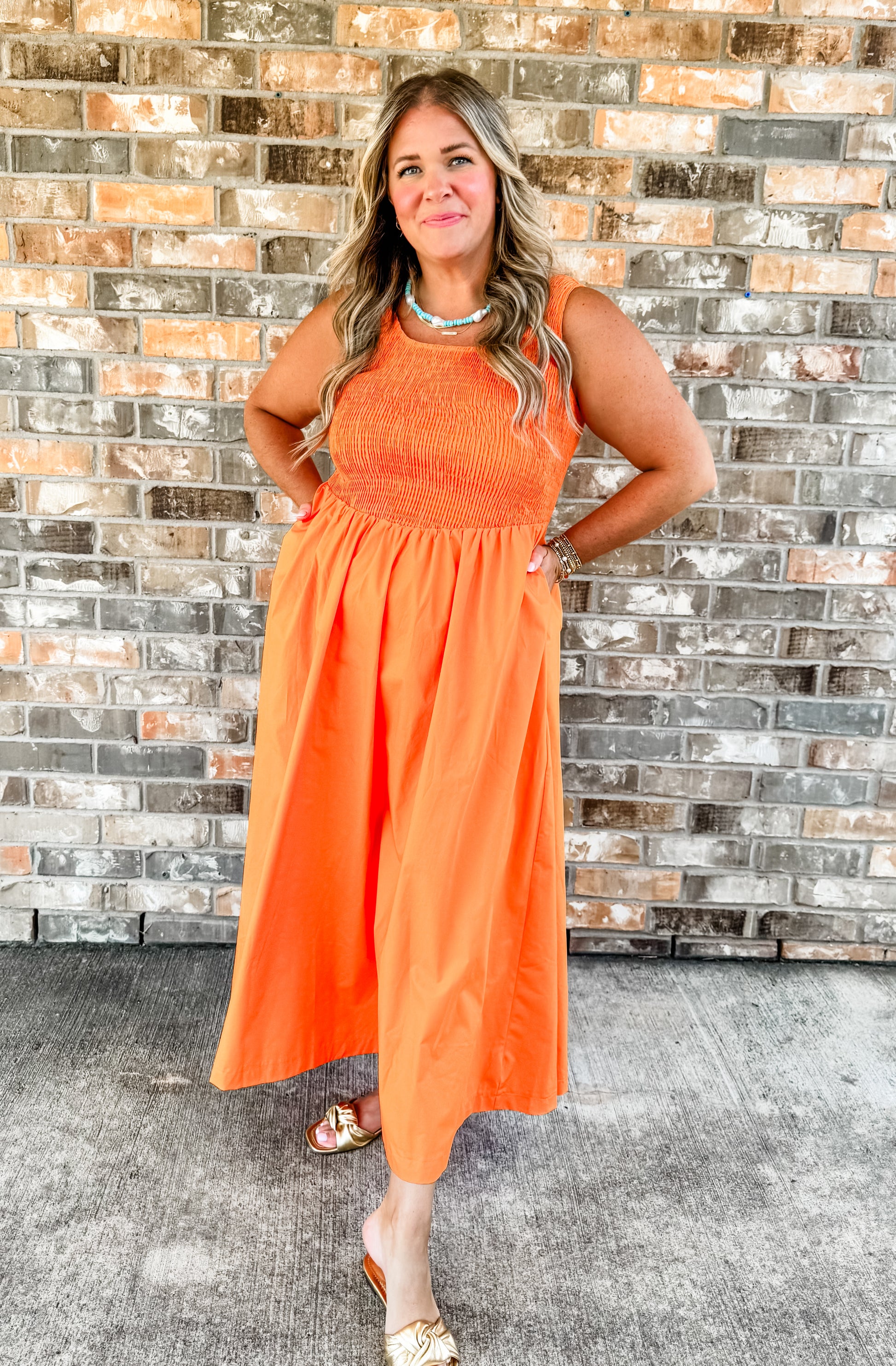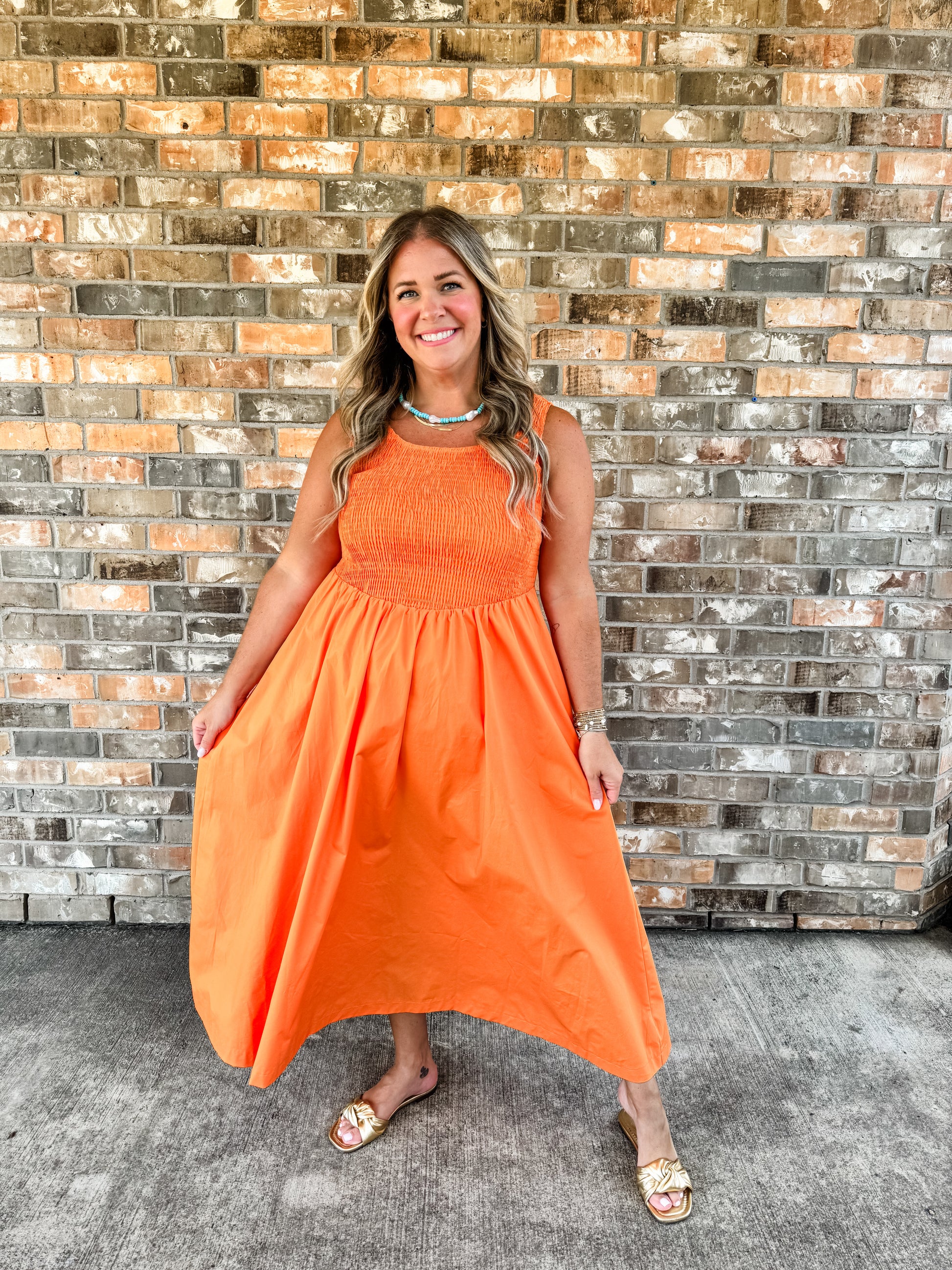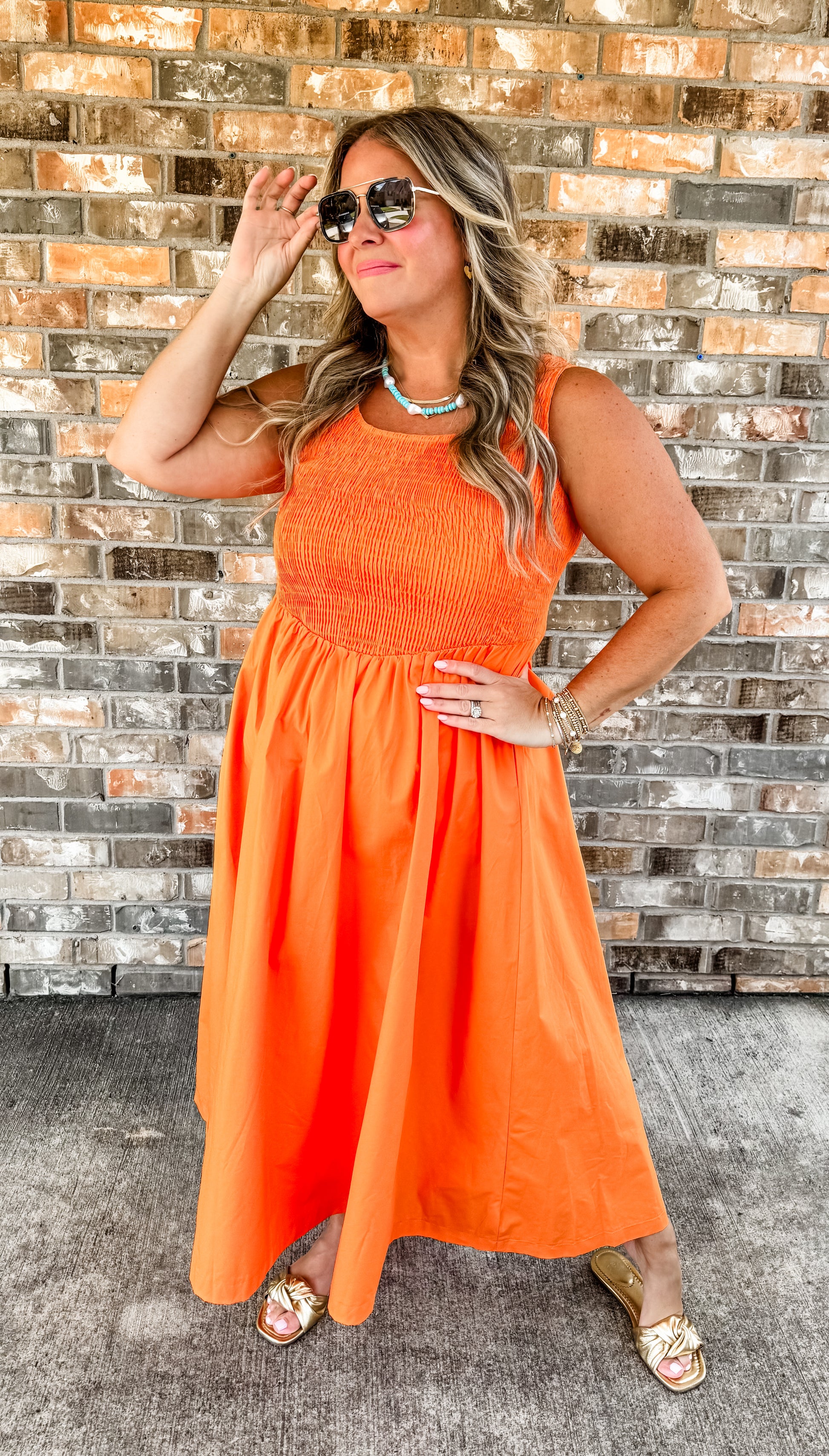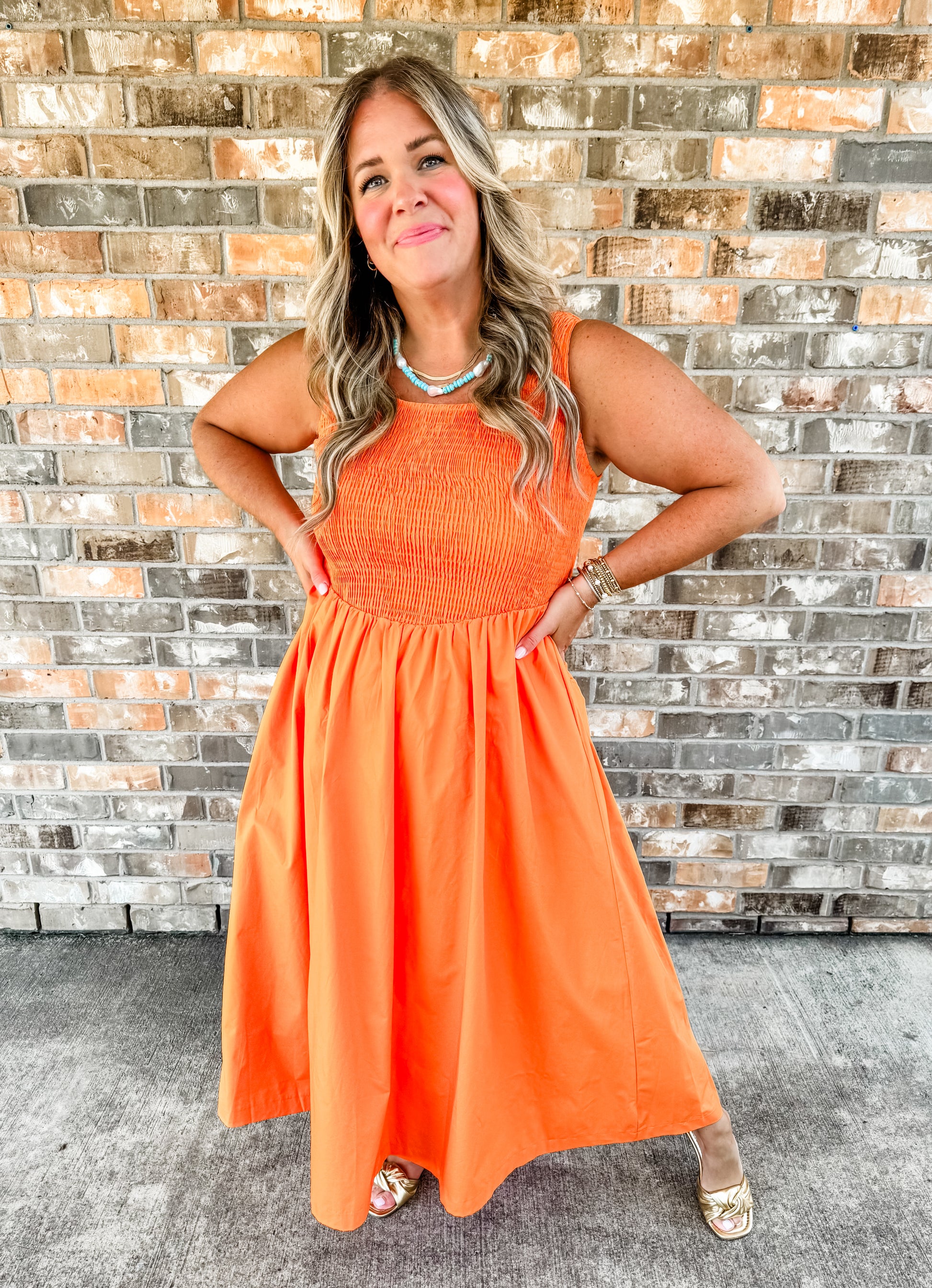 Turn heads in this bright orange maxi dress, featuring a stretchy top that moves with you and a flowy bottom that dances with every step. Perfect for sunny days and playful evenings, it combines comfort and vibrant style effortlessly.