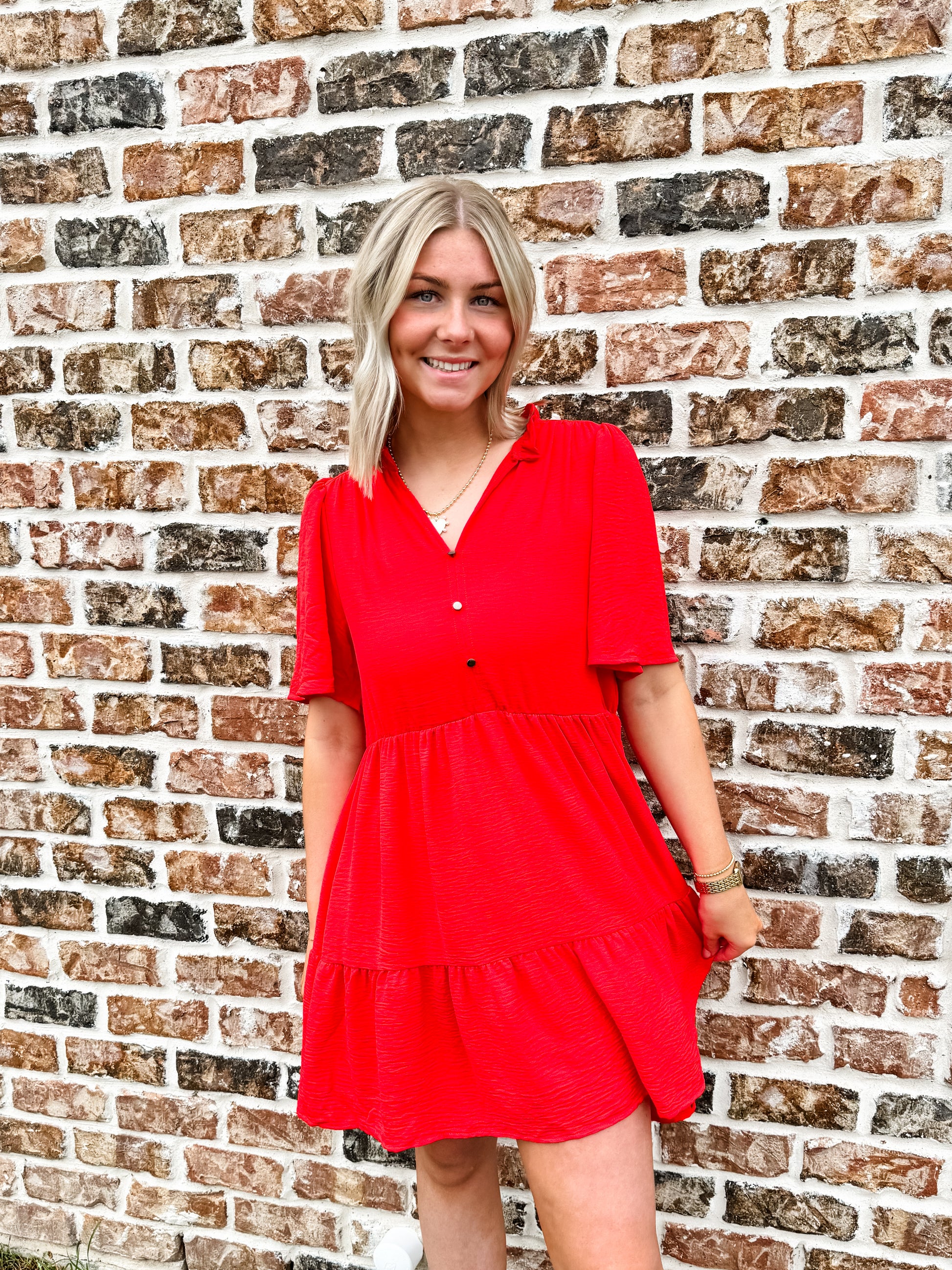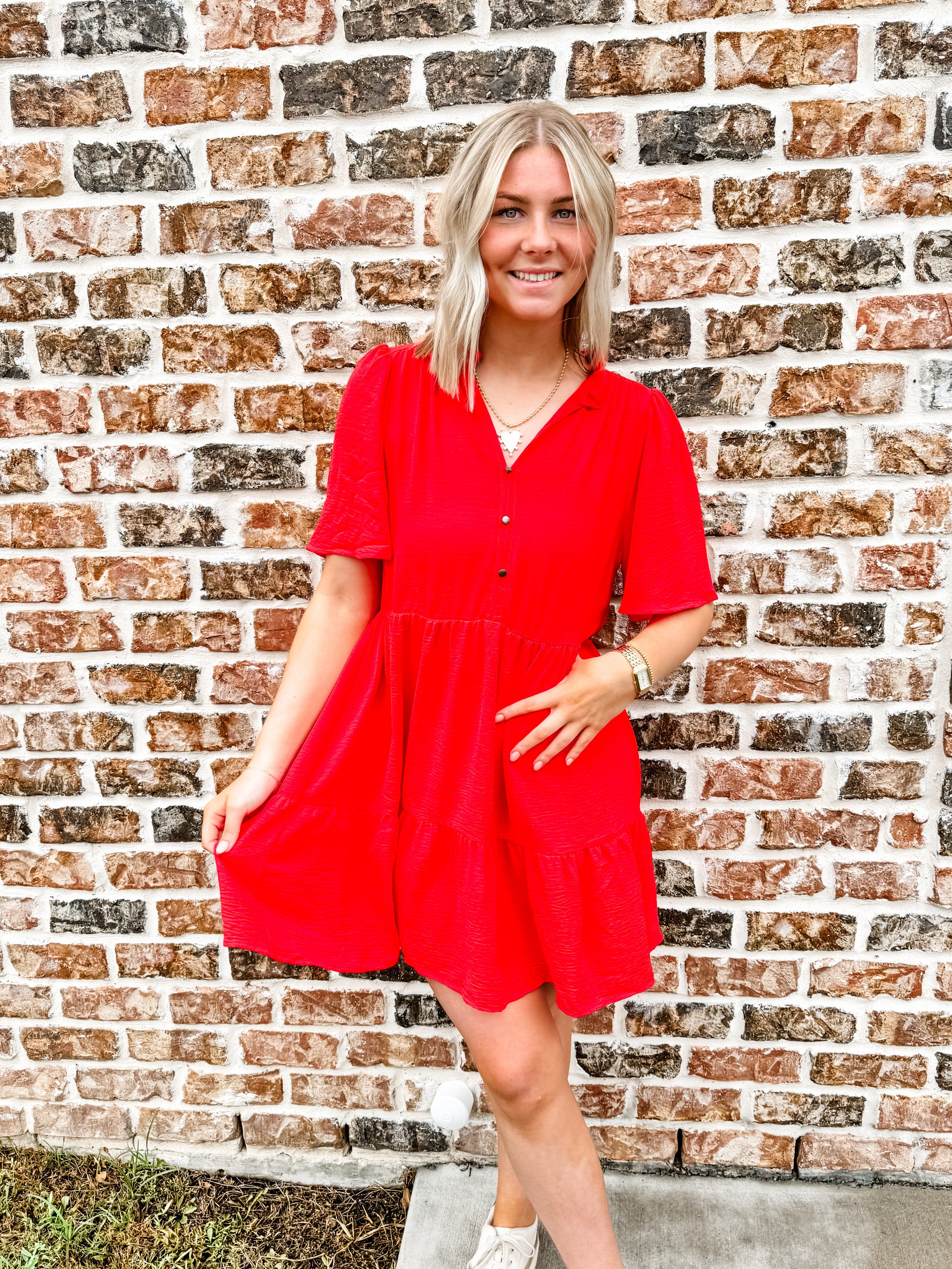 Step into fun and flair with the Rosie Red Dress! This playful, knee-length dress features vibrant red fabric and short sleeves, perfect for twirling through sunny days or lively evenings. Its flattering cut offers comfort and style, making it your go-to choice for effortless charm wherever you go.