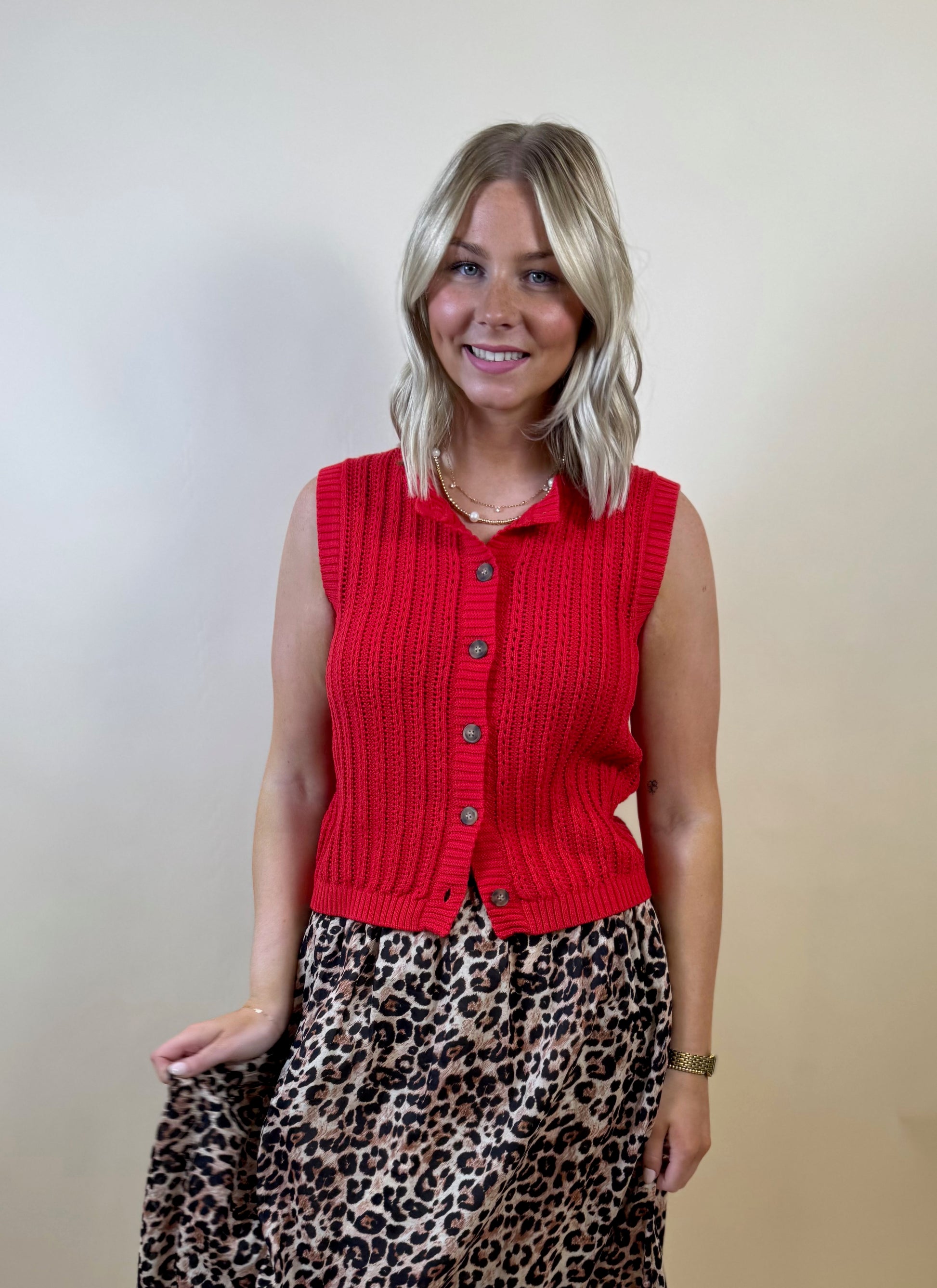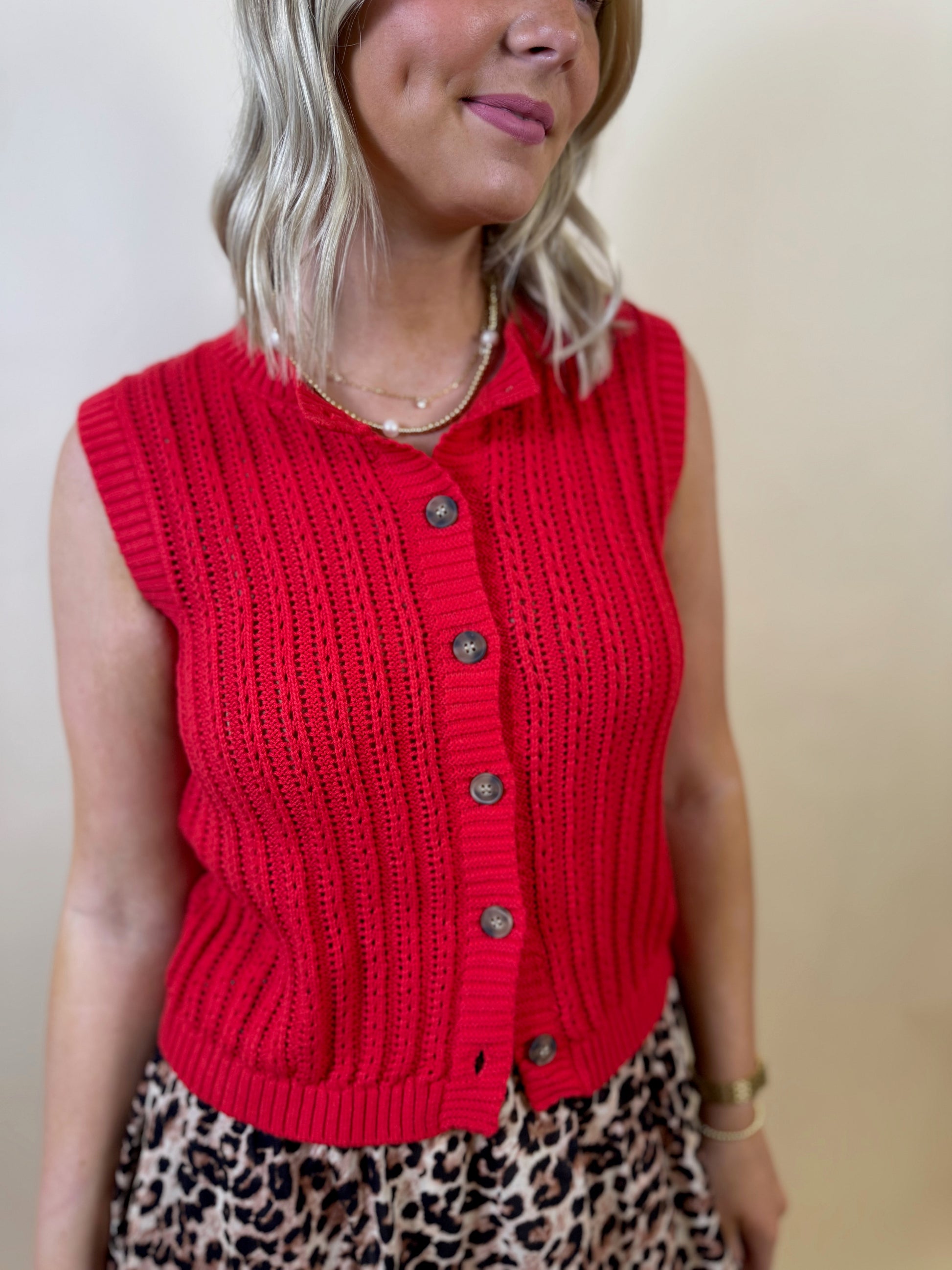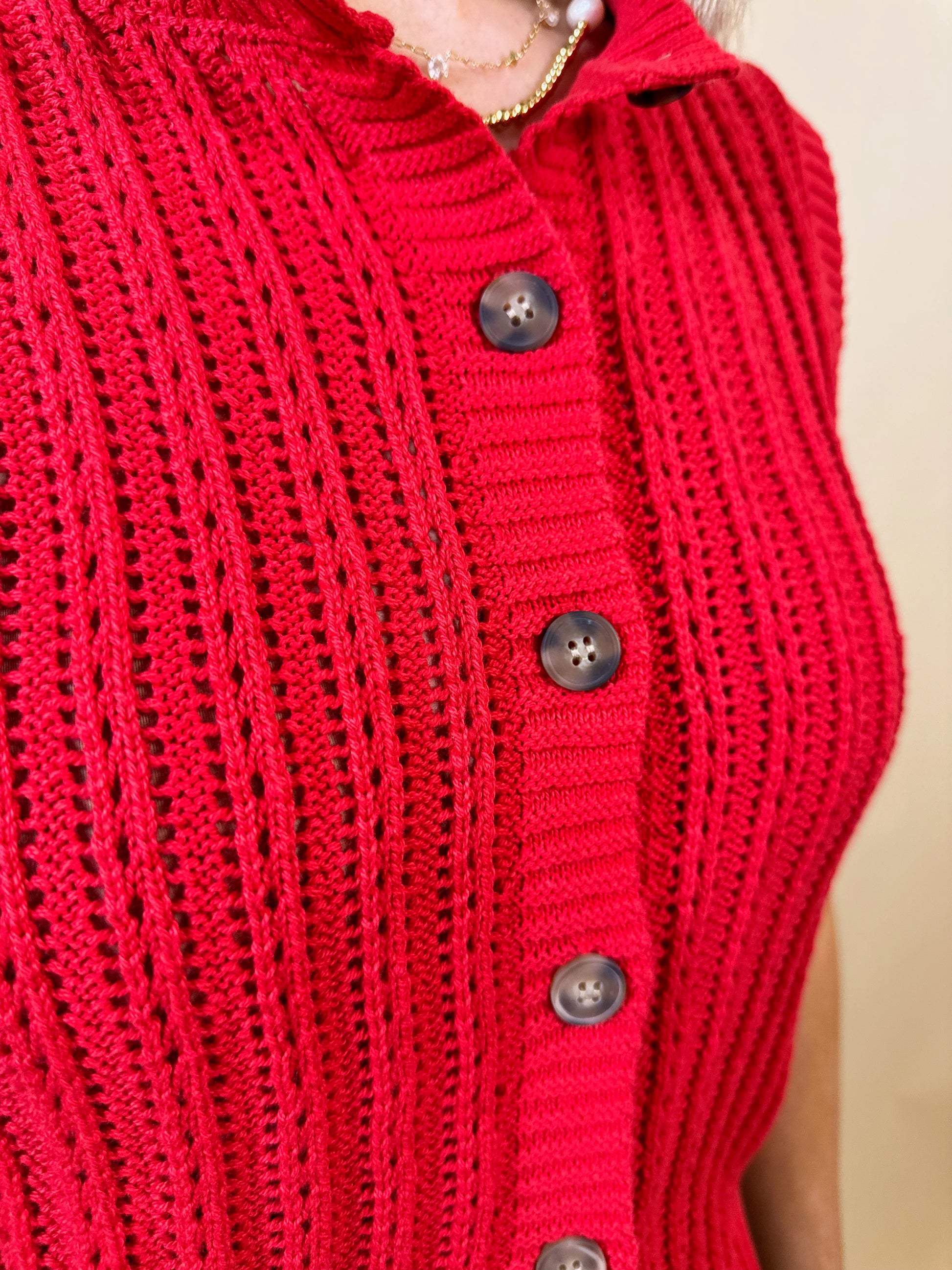 This Ruby Red Sleeveless top is your go-to for breezy, sunny days. Crafted from airy, lightweight knit fabric, it features a playful button-down front and a charming collar that adds a touch of flair. Perfect for layering or wearing solo, it keeps you cool and stylish with every wear.