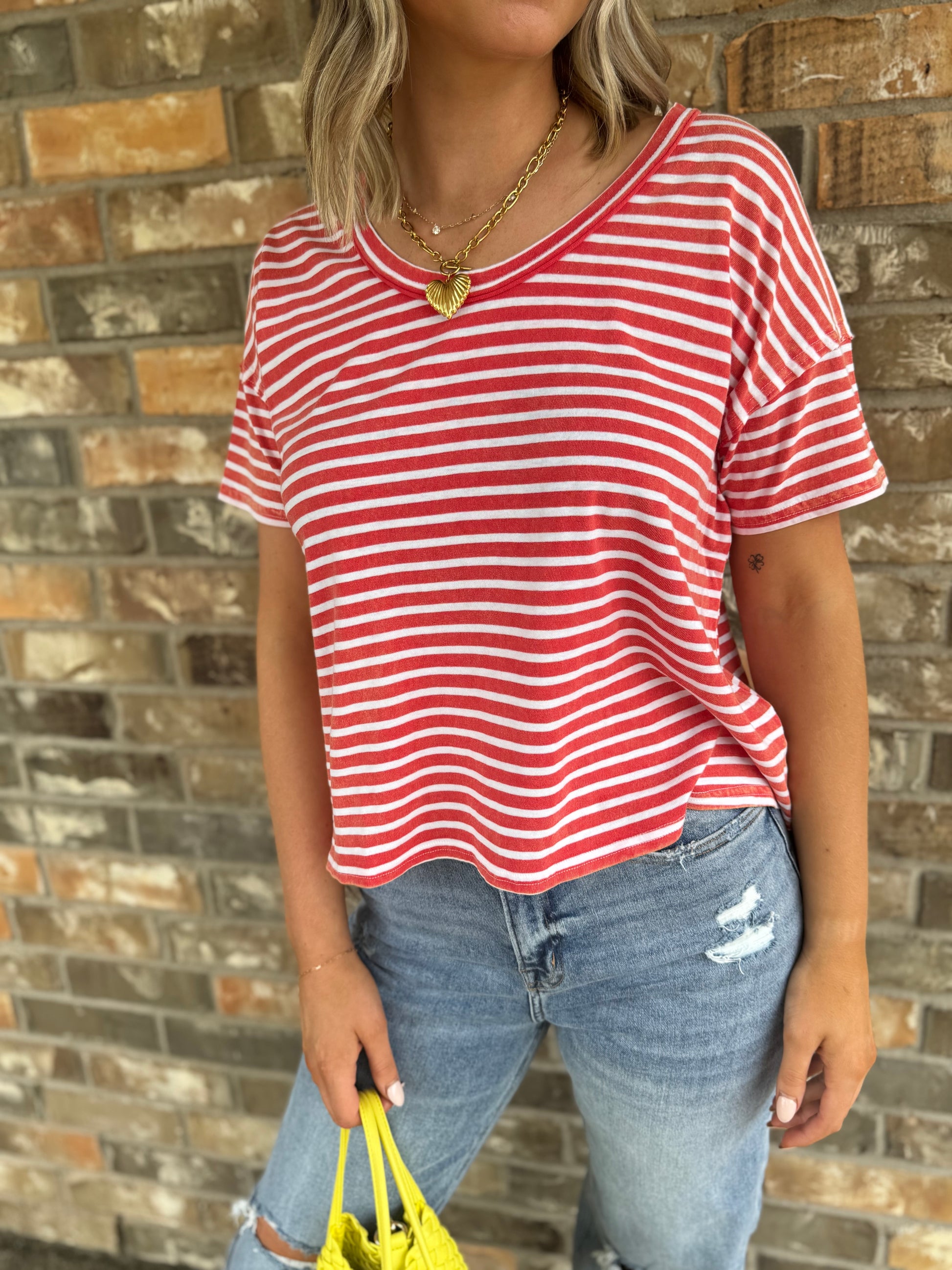 Elevate your casual wardrobe with the Washed Up For You Scoop Neck tee, featuring a striking red and white V-neck design. Crafted for both comfort and style, this shirt offers a flattering neckline that enhances any outfit. Perfect for everyday wear, it balances bold color contrast with a relaxed fit, making it an effortless choice to stand out while staying comfortable all day long. Embrace a tee that’s as versatile as your lifestyle.